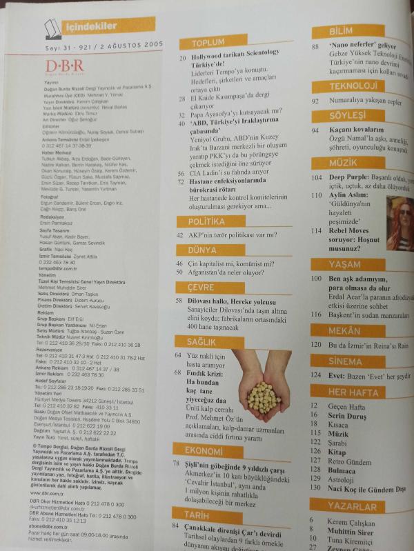 TEMPO DERGİSİ - 2 AĞUSTOS 2005 - ERDAL İPEKEŞN - 28 ŞUBATÇI PAŞALARA LOJMAN VE KORUMA YOK - AYTUNÇ ALTINDAL'DAN ŞOK İDDİA - YENİ PAPA AYASOFYA'DA DUA EDERSE KİLİSE OLUR - FINDIK ZARARLI MI YARARLI MI? - EL KAİDE KASIMPAŞA'DA - ELİF ÖZGÜL NAMAL - KAÇANI KOVALARIM - BÜLENT ORTAKÇİGİL - ZUHAL OLCAY - NEŞET ERTAŞ - NESRİN TOPKAPI - AYLIN ASLIM - ERDAL ACAR - ÖZGÜ NAMAL - ATİLLA KOÇ - BÜLENT ECEVİT - SÜLEYMAN DEMİREL - RECEP TAYYİP ERDOĞAN - DEMİ MOORE - RICKY MARTIN - OLIVER STONE - CANSU DERE - NURGÜL YEŞİLÇAY - RÜŞTÜ REÇBER - NICOLE KIDMAN - ŞİŞLİ'NİN GÖBEĞİNDE 9 YILDIZLI ÇARŞI - ÇANAKKALE DİRENİŞİ ÇAR'I DEVİRDİ - TEMPO DERGİLER YARIŞINDA LİDER - AŞK BİR SONBAHAR İPTİLASI - 130 SAYFA - - TAM TAKIM DERGİ, Sedat Simavi tarafından kaleme alınmıştır. Kitap İdeal tarafından yayınlanmıştır. 130 sayfadır. TEMPO DERGİSİ - 2 AĞUSTOS 2005 - ERDAL İPEKEŞN - 28 ŞUBATÇI PAŞALARA LOJMAN VE KORUMA YOK - AYTUNÇ ALTINDAL'DAN ŞOK İDDİA - YENİ PAPA AYASOFYA'DA DUA EDERSE KİLİSE OLUR - FINDIK ZARARLI MI YARARLI MI? - EL KAİDE KASIMPAŞA'DA - ELİF ÖZGÜL NAMAL - KAÇANI KOVALARIM - BÜLENT ORTAKÇİGİL - ZUHAL OLCAY - NEŞET ERTAŞ - NESRİN TOPKAPI - AYLIN ASLIM - ERDAL ACAR - ÖZGÜ NAMAL - ATİLLA KOÇ - BÜLENT ECEVİT - SÜLEYMAN DEMİREL - RECEP TAYYİP ERDOĞAN - DEMİ MOORE - RICKY MARTIN - OLIVER STONE - CANSU DERE - NURGÜL YEŞİLÇAY - RÜŞTÜ REÇBER - NICOLE KIDMAN - ŞİŞLİ'NİN GÖBEĞİNDE 9 YILDIZLI ÇARŞI - ÇANAKKALE DİRENİŞİ ÇAR'I DEVİRDİ - TEMPO DERGİLER YARIŞINDA LİDER - AŞK BİR SONBAHAR İPTİLASI - 130 SAYFA - - TAM TAKIM DERGİ adlı eser Türkçe dilindedir.