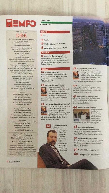 TEMPO – SAYI 687 – 8–14 ŞUBAT 2001 – 130 SAYFA – “OKUNMADIK KİTAP KALMASIN” KAMPANYASI: HERKESE ÜNLÜ YAZARLARDAN BİR KİTAP – TÜRKİYE’NİN EN ÜNLÜ YATIRIMCILARI 2001’DE HAYAT KURTARACAK HİSSELERİ SEÇTİ – GAFFAR OKKAN’IN BABASI: “KATİLLER YAKALANSA BİLE AFLA ÇIKARLAR” – AĞCA’YI EN YAKIN ARKADAŞI İHBAR ETMİŞ – AKSARAY’DA YASADIŞI KÜRESELLEŞMENİN MERKEZİNE GİRİLDİ – ERBAKAN’IN “İSLAMCI” MUHALİFİ: ŞEYH ESAD COŞAN – İNTİHAR MI, CİNAYET Mİ? KONTES FRANCESCA VACCA AGUSTA’NIN GİZEMLİ ÖLÜMÜ – HULKİ CEVİZOĞLU: “YAYINCILIK CAZİBEM YÜKSEK” – KADIN VE ERKEK ARASINDAKİ 41 FARK – TRT’DE REYTİNG RÜZGARI: KAVAKLIDERE’DEN YÜKSELİŞ – POLİS ÜNİVERSİTESİ KURULUYOR – BEYİN RENGİNİZ HANGİSİ? HERRMANN TESTİ TÜRKİYE’DE – FINDIKKIRAN BALESİ: AKM’DE GÖRSEL ŞÖLEN – HER HAFTA: SERDAR TURGUT, FARUK BİLDİRİCİ, KURTHAN FİŞEK, BİROL BAYRAM – GAFFAR OKKAN – ESAD COŞAN – HULKİ CEVİZOĞLU – GÜNAY USLU – FRANCESCA VACCA AGUSTA – SERDAR TURGUT – FARUK BİLDİRİCİ – KURTHAN, Sedat Simavi tarafından kaleme alınmıştır. Kitap İdeal tarafından yayınlanmıştır. 114 sayfadır. TEMPO – SAYI 687 – 8–14 ŞUBAT 2001 – 130 SAYFA – “OKUNMADIK KİTAP KALMASIN” KAMPANYASI: HERKESE ÜNLÜ YAZARLARDAN BİR KİTAP – TÜRKİYE’NİN EN ÜNLÜ YATIRIMCILARI 2001’DE HAYAT KURTARACAK HİSSELERİ SEÇTİ – GAFFAR OKKAN’IN BABASI: “KATİLLER YAKALANSA BİLE AFLA ÇIKARLAR” – AĞCA’YI EN YAKIN ARKADAŞI İHBAR ETMİŞ – AKSARAY’DA YASADIŞI KÜRESELLEŞMENİN MERKEZİNE GİRİLDİ – ERBAKAN’IN “İSLAMCI” MUHALİFİ: ŞEYH ESAD COŞAN – İNTİHAR MI, CİNAYET Mİ? KONTES FRANCESCA VACCA AGUSTA’NIN GİZEMLİ ÖLÜMÜ – HULKİ CEVİZOĞLU: “YAYINCILIK CAZİBEM YÜKSEK” – KADIN VE ERKEK ARASINDAKİ 41 FARK – TRT’DE REYTİNG RÜZGARI: KAVAKLIDERE’DEN YÜKSELİŞ – POLİS ÜNİVERSİTESİ KURULUYOR – BEYİN RENGİNİZ HANGİSİ? HERRMANN TESTİ TÜRKİYE’DE – FINDIKKIRAN BALESİ: AKM’DE GÖRSEL ŞÖLEN – HER HAFTA: SERDAR TURGUT, FARUK BİLDİRİCİ, KURTHAN FİŞEK, BİROL BAYRAM – GAFFAR OKKAN – ESAD COŞAN – HULKİ CEVİZOĞLU – GÜNAY USLU – FRANCESCA VACCA AGUSTA – SERDAR TURGUT – FARUK BİLDİRİCİ – KURTHAN adlı eser Türkçe dilindedir.