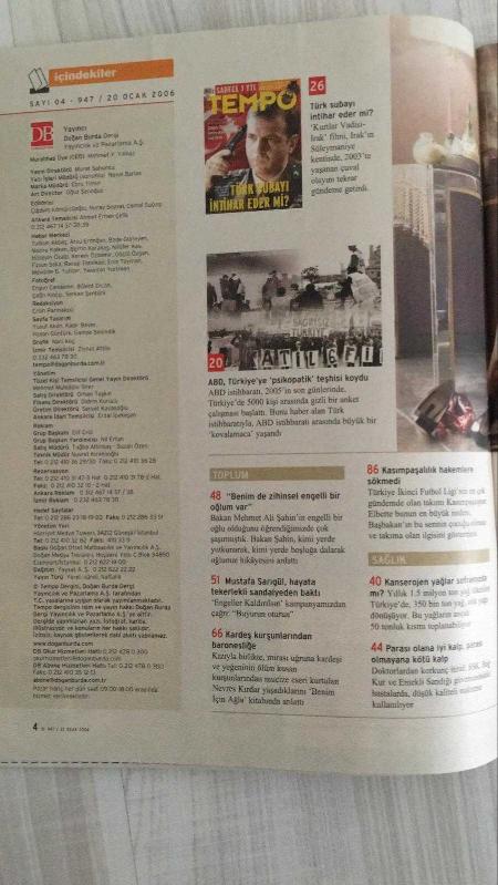 TEMPO – SAYI 947 – 20 OCAK 2006 – 114 SAYFA – “TÜRK SUBAYI İNTİHAR EDER Mİ?”: KURTLAR VADİSİ IRAK FİLMİYLE ÇUVAL OLAYI YENİDEN GÜNDEMDE – TÜRK İSTİHBARATÇILARI GİZLİ AMERİKAN ANKETİNİ ELE GEÇİRDİ – ABD’DEN TÜRKİYE’YE “PSİKOPATİK” TEŞHİSİ – MEHMET ALİ ŞAHİN’İN ENGELLİ EVLAT HÜZNÜ – MUSTAFA SARIGÜL “ENGELLER KALDIRILSIN” KAMPANYASINDA TEKERLEKLİ SANDALYEDE – NEVRES KIRDAR’DAN “BENİM İÇİN AĞLA”: KURŞUNLARDAN BARONESLİĞE – KASIMPAŞA’NIN YÜKSELİŞİ: BAŞBAKAN’IN SEMTİ TAKIMI GÜNDEMDE – KANSEROJEN YAĞLAR SOFRAMIZDA MI? SADECE 50 TON TOPLANABİLİYOR – MUSTAFA EZİCİ: “MERDİVEN ALTI ÜRETİM TÜRK HALKINI TEHDİT EDİYOR” – PARASI OLANA İYİ KALP, PARASI OLMAYANA KÖTÜ KALP: SSK VE EMEKLİ SANDIĞI HASTALARINA DÜŞÜK KALİTELİ MALZEME – ATIK YAĞLARIN GERİ DÖNÜŞÜMÜNDE YÖNETMELİKLER YETERSİZ – HER HAFTA: MURAT SABUNCU, AHMET ERHAN ÇELİK, CEMAL SUBAŞI, NURAY SOYSAL, BERRİN KARAKAŞ – MEHMET ALİ ŞAHİN – MUSTAFA SARIGÜL – NEVRES KIRDAR – MUSTAFA EZİCİ – TURGUT ÖZAL – MURAT SABUNCU – AHMET ERHAN ÇELİK – CEMAL SUB, Sedat Simavi tarafından kaleme alınmıştır. Kitap İdeal tarafından yayınlanmıştır. 82 sayfadır. TEMPO – SAYI 947 – 20 OCAK 2006 – 114 SAYFA – “TÜRK SUBAYI İNTİHAR EDER Mİ?”: KURTLAR VADİSİ IRAK FİLMİYLE ÇUVAL OLAYI YENİDEN GÜNDEMDE – TÜRK İSTİHBARATÇILARI GİZLİ AMERİKAN ANKETİNİ ELE GEÇİRDİ – ABD’DEN TÜRKİYE’YE “PSİKOPATİK” TEŞHİSİ – MEHMET ALİ ŞAHİN’İN ENGELLİ EVLAT HÜZNÜ – MUSTAFA SARIGÜL “ENGELLER KALDIRILSIN” KAMPANYASINDA TEKERLEKLİ SANDALYEDE – NEVRES KIRDAR’DAN “BENİM İÇİN AĞLA”: KURŞUNLARDAN BARONESLİĞE – KASIMPAŞA’NIN YÜKSELİŞİ: BAŞBAKAN’IN SEMTİ TAKIMI GÜNDEMDE – KANSEROJEN YAĞLAR SOFRAMIZDA MI? SADECE 50 TON TOPLANABİLİYOR – MUSTAFA EZİCİ: “MERDİVEN ALTI ÜRETİM TÜRK HALKINI TEHDİT EDİYOR” – PARASI OLANA İYİ KALP, PARASI OLMAYANA KÖTÜ KALP: SSK VE EMEKLİ SANDIĞI HASTALARINA DÜŞÜK KALİTELİ MALZEME – ATIK YAĞLARIN GERİ DÖNÜŞÜMÜNDE YÖNETMELİKLER YETERSİZ – HER HAFTA: MURAT SABUNCU, AHMET ERHAN ÇELİK, CEMAL SUBAŞI, NURAY SOYSAL, BERRİN KARAKAŞ – MEHMET ALİ ŞAHİN – MUSTAFA SARIGÜL – NEVRES KIRDAR – MUSTAFA EZİCİ – TURGUT ÖZAL – MURAT SABUNCU – AHMET ERHAN ÇELİK – CEMAL SUB adlı eser Türkçe dilindedir.