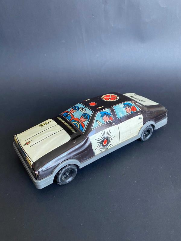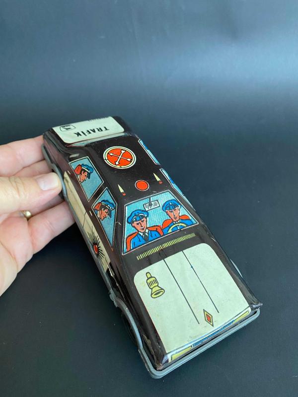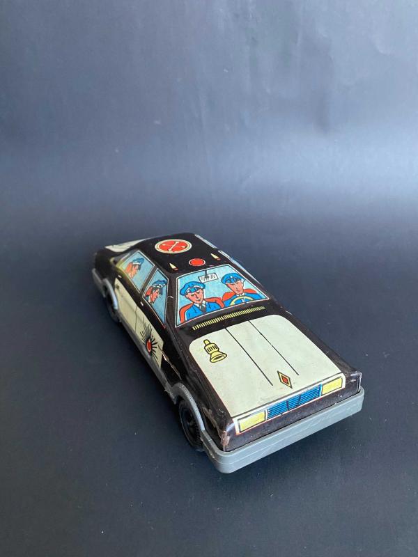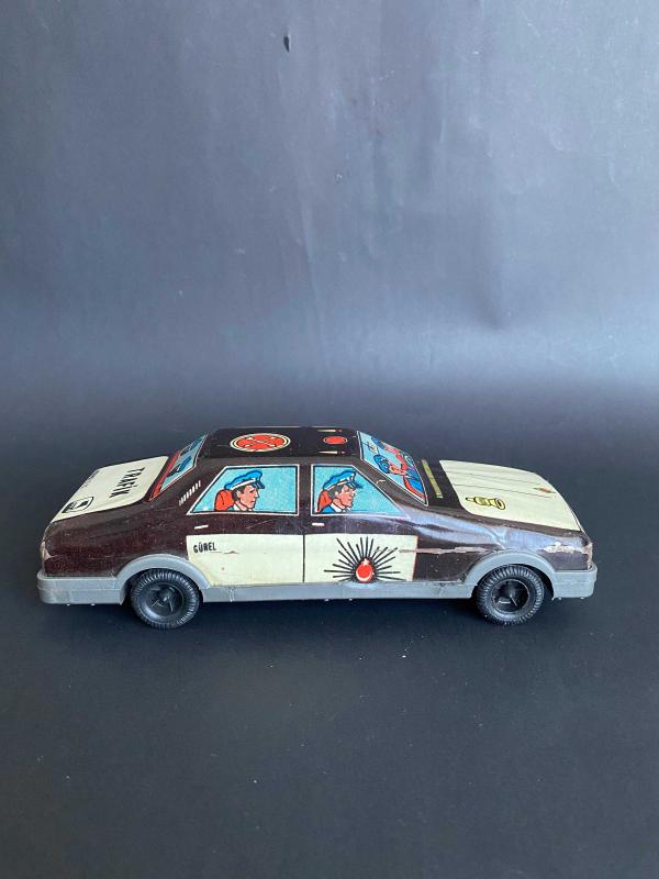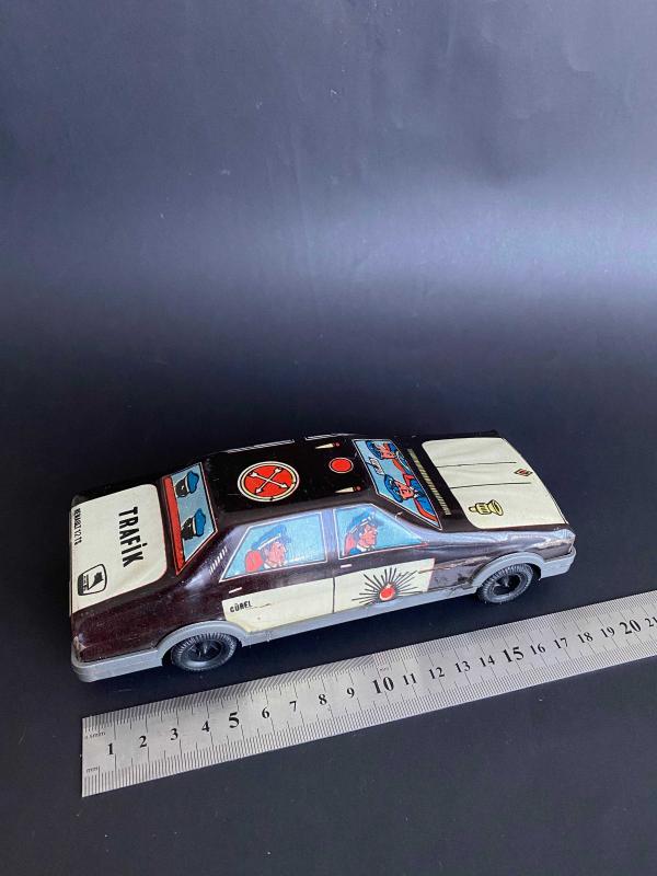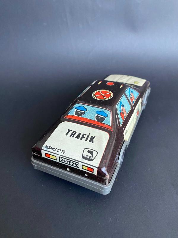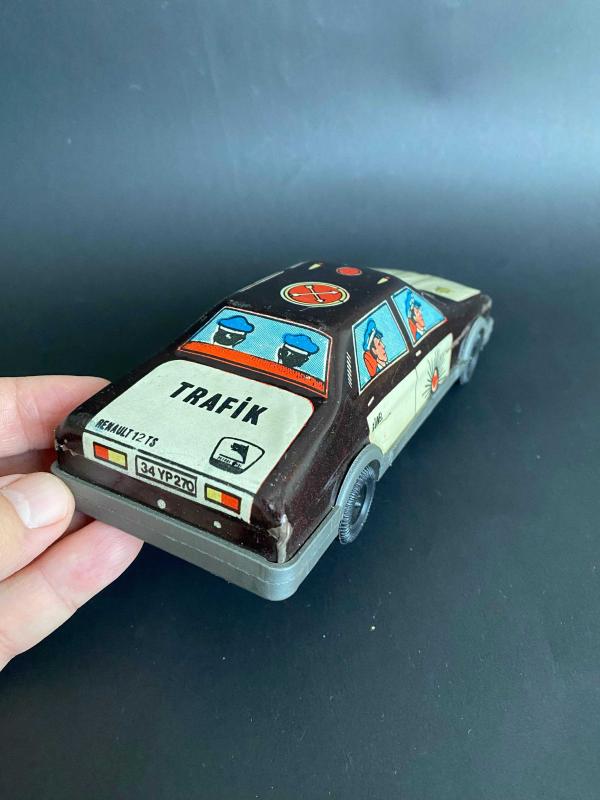 70’li yıllardan teneke araba. Teneke trafik polisi arabası. Gürel markalı teneke araba. Renault 12 TS model teneke araba. Arabanın arkasında Petrol Ofis logosu da var. 34 YP 270 plakalı. Ebat: 18,5 cm