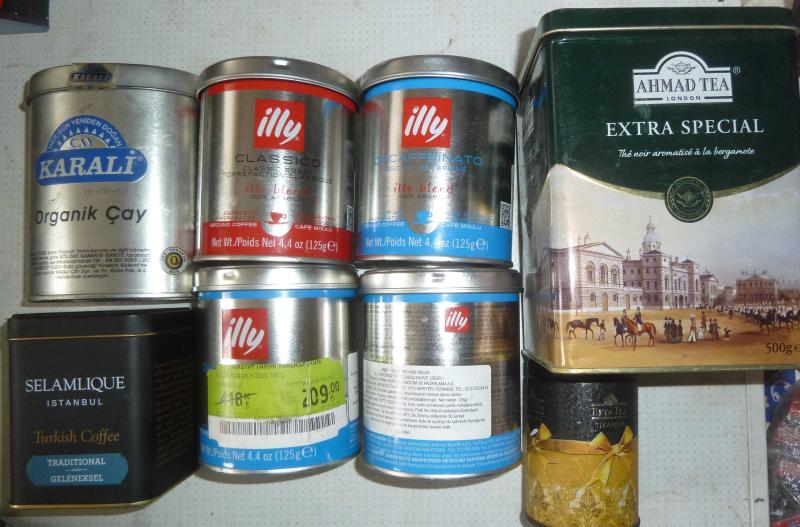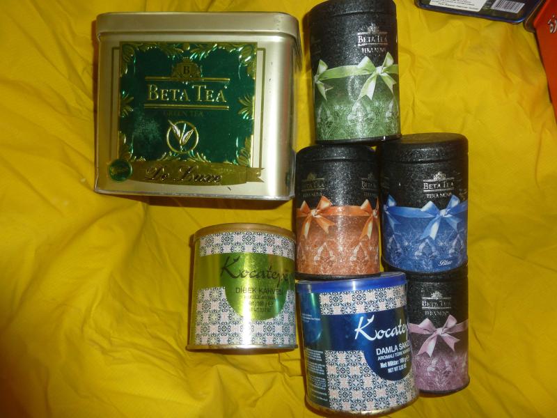 23 ADET TENEKE VE KARTON Kahve ve çay kutusu 4 ADEDİ KARTON DİĞERLERİ TENEKE RESİNDEKİLERİN TAMAMI GÖNDERİLECEK ARAS KARGO İLE GÖNDERİLECEKTİR