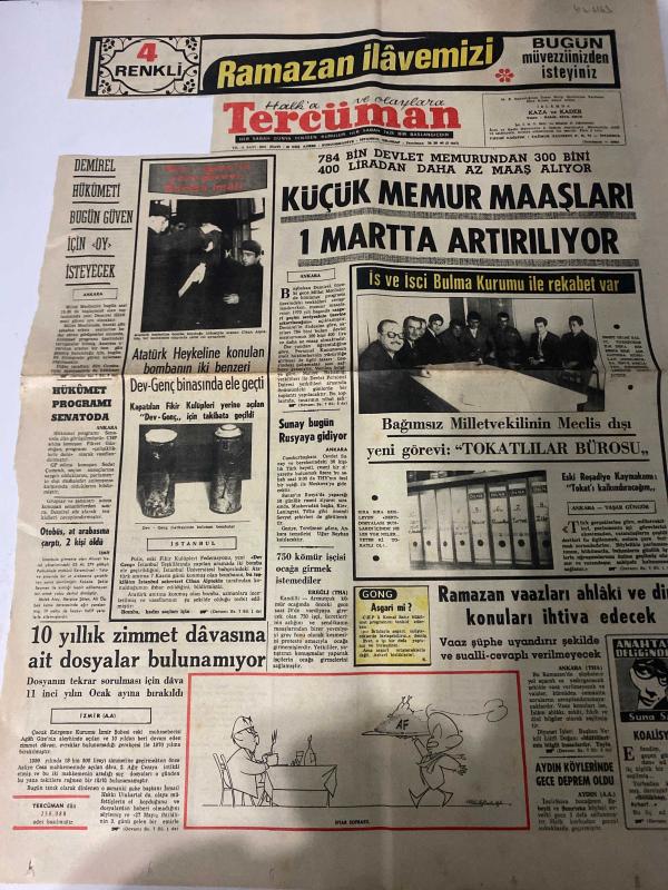 TERCÜMAN GAZETESİ - 12 KASIM 1969 - SADECE 2 SAYFADIR -Demirel-Suna San-Zelyut A. Menüt-O. Filiz-Rauf Tamer-Mehmet Ali Sebük Demirel Hükümeti bugün güven için oy isteyecek-Hükümet programı senatoda-Atatürk Heykeline konulan bombanın iki benzeri Dev-Genç binasında ele geçti-Küçük memur maaşları 1 Martta artırılıyor-İş ve İşçi Bulma Kurumu ile rekabet var-Bağımsız milletvekillerinin Meclis dışı yeni görevi: Tokatlılar Bürosu-10 yıllık zimmet davasına ait dosyalar bulunamıyor-Ramazan vaazları ahlâki ve dini konuları ihtiva edecek-Bir genç öldü, iki kişi yaralandı-Otobüs, arabasına çarptı, 2 kişi öldü-Kaza ve kader-Asgari mi?-Koalisyon için şartlar müsait-Suayının bugünü Rusya’ya gidiyor-Hükümetin programı senatoda-İran Air takdim eder kış programımızda daha çok beldeye daha çok sefer-Hoş Geldin-Gerçek Savcılar-Gün Işığında-Yıldızınız ne diyor-3 sual 3 cevap-Sözün kısası Fasulye-Sözün kısası Sorumlu-Sözün kısası Hiç olmazsa beraberlik-Sözün kısası Kıtlık-Sözün kısası General 20-Sözün kısa, Kemal Ilıcak tarafından kaleme alınmıştır. TERCÜMAN GAZETESİ - 12 KASIM 1969 - SADECE 2 SAYFADIR -Demirel-Suna San-Zelyut A. Menüt-O. Filiz-Rauf Tamer-Mehmet Ali Sebük Demirel Hükümeti bugün güven için oy isteyecek-Hükümet programı senatoda-Atatürk Heykeline konulan bombanın iki benzeri Dev-Genç binasında ele geçti-Küçük memur maaşları 1 Martta artırılıyor-İş ve İşçi Bulma Kurumu ile rekabet var-Bağımsız milletvekillerinin Meclis dışı yeni görevi: Tokatlılar Bürosu-10 yıllık zimmet davasına ait dosyalar bulunamıyor-Ramazan vaazları ahlâki ve dini konuları ihtiva edecek-Bir genç öldü, iki kişi yaralandı-Otobüs, arabasına çarptı, 2 kişi öldü-Kaza ve kader-Asgari mi?-Koalisyon için şartlar müsait-Suayının bugünü Rusya’ya gidiyor-Hükümetin programı senatoda-İran Air takdim eder kış programımızda daha çok beldeye daha çok sefer-Hoş Geldin-Gerçek Savcılar-Gün Işığında-Yıldızınız ne diyor-3 sual 3 cevap-Sözün kısası Fasulye-Sözün kısası Sorumlu-Sözün kısası Hiç olmazsa beraberlik-Sözün kısası Kıtlık-Sözün kısası General 20-Sözün kısa adlı eser Türkçe dilindedir. Eserin içeriğinde Türkçe dilinde bölümlere de yer verilmektedir.