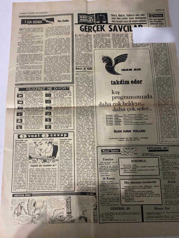 TERCÜMAN GAZETESİ - 12 KASIM 1969 - SADECE 2 SAYFADIR -Demirel-Suna San-Zelyut A. Menüt-O. Filiz-Rauf Tamer-Mehmet Ali Sebük Demirel Hükümeti bugün güven için oy isteyecek-Hükümet programı senatoda-Atatürk Heykeline konulan bombanın iki benzeri Dev-Genç binasında ele geçti-Küçük memur maaşları 1 Martta artırılıyor-İş ve İşçi Bulma Kurumu ile rekabet var-Bağımsız milletvekillerinin Meclis dışı yeni görevi: Tokatlılar Bürosu-10 yıllık zimmet davasına ait dosyalar bulunamıyor-Ramazan vaazları ahlâki ve dini konuları ihtiva edecek-Bir genç öldü, iki kişi yaralandı-Otobüs, arabasına çarptı, 2 kişi öldü-Kaza ve kader-Asgari mi?-Koalisyon için şartlar müsait-Suayının bugünü Rusya’ya gidiyor-Hükümetin programı senatoda-İran Air takdim eder kış programımızda daha çok beldeye daha çok sefer-Hoş Geldin-Gerçek Savcılar-Gün Işığında-Yıldızınız ne diyor-3 sual 3 cevap-Sözün kısası Fasulye-Sözün kısası Sorumlu-Sözün kısası Hiç olmazsa beraberlik-Sözün kısası Kıtlık-Sözün kısası General 20-Sözün kısa adlı eser, Kitap > Süreli Yayınlar > Gazeteler > Türkiye > Genel > Günlük kategorisinde İkinci El olarak satıştadır.