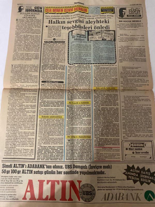 TERCÜMAN GAZETESİ - 12 KASIM 1985 - SADECE 2 SAYFADIR -Evren-Kenan Akın-Alpteoğmen-Türkeş-Özal-Taha Akyol-Ahmet Kabaklı-Rauf Tamer-Nazlı Ilıcak-Celal Bayar-Orçun Urgu-Emin Erdoğan-Hikmet Bayrak-Fakirleşerek büyüyoruz-Türkeş: Yansızlık yanlış davranıştır-Evren Abu Dabi’de Dostluk turu başladı-Hedef Türkiye’yi yıpratmak-Ermeni sahte mültecileri sömürüyor-Özal: Öğrenci affı tasarısı hazır-Ağrı Dağı’ndan düşen kamyonda 18 kişi öldü-Benzin deposunda özel zula Eroin operasyonu-Peşin vergi hafifletiliyor-Halkın sevgisi aleyhteki teşebbüsleri önledi-Bir haftalık hürriyet-Bir tebliğ ve düşündürdüğü-Bulgar Yunan cinayet ortaklığı-Bir küçük mesele adlı eser, Kitap > Süreli Yayınlar > Gazeteler > Türkiye > Genel > Günlük kategorisinde İkinci El olarak satıştadır.