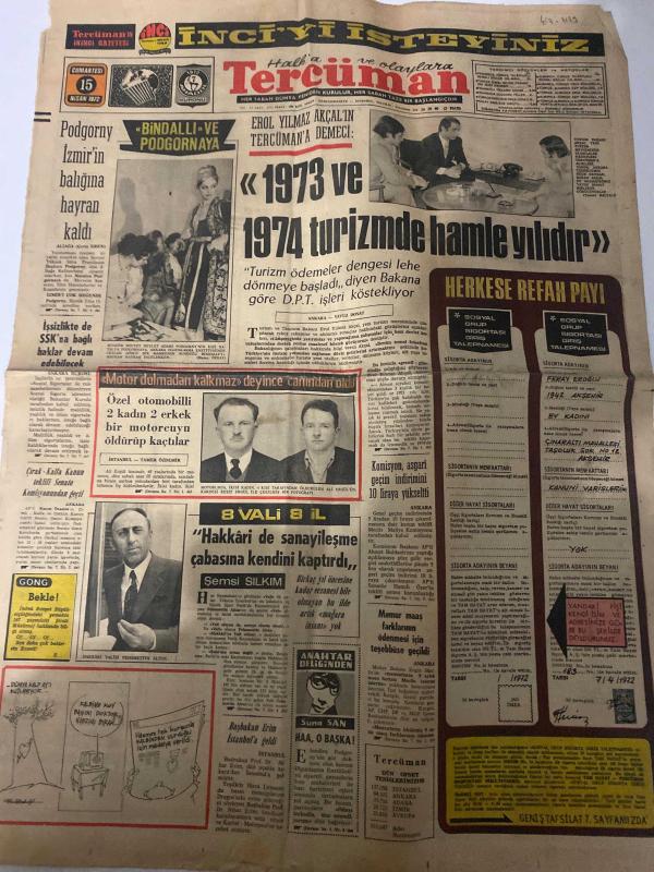 TERCÜMAN GAZETESİ - 15 NİSAN 1972 - SADECE 2 SAYFADIR -Podgorny-Bindallı-Podgornaya-Erol Yılmaz Akalın-Şemsi Sılkım-Suna San-Ahmet Kabaklı-Ali Rıza Alp-Prof. Dr. Nurettin Şazi Kösemihal-Rauf Tamer-Züleyha Münif Podgorny İzmir’in balığına hayran kaldı-Bindallı ve Podgornaya-1973 ve 1974 turizmde hamle yıldır-Herkese refah payı-Motor dolmadan kalkmaz deyince canıtıdan öldü-Hakkari’de sanayileşme çabasına kendini kaptırdı-Gong Bekle!-Anahtar Deliğinden Haa o başka!-Gün ışığında Koca Sinan-Milli Eğitimdeki müessif olay-Demokrasi ve iktisat-Sözün kısası-3 sual 3 cevap-Orturan hangi eşzireleri yapabilir?-Dünyada tarım yeri kalmadı mı?-Deha çocuklukta belli olur mu?-Mevlid-Bereket Mahsulü Behiye Aksoy Ahmet Özhan Nebahat Çehre Selçuk Ural Şehrazat MÜJDAT Gezen Selma Güneri, Kemal Ilıcak tarafından kaleme alınmıştır. TERCÜMAN GAZETESİ - 15 NİSAN 1972 - SADECE 2 SAYFADIR -Podgorny-Bindallı-Podgornaya-Erol Yılmaz Akalın-Şemsi Sılkım-Suna San-Ahmet Kabaklı-Ali Rıza Alp-Prof. Dr. Nurettin Şazi Kösemihal-Rauf Tamer-Züleyha Münif Podgorny İzmir’in balığına hayran kaldı-Bindallı ve Podgornaya-1973 ve 1974 turizmde hamle yıldır-Herkese refah payı-Motor dolmadan kalkmaz deyince canıtıdan öldü-Hakkari’de sanayileşme çabasına kendini kaptırdı-Gong Bekle!-Anahtar Deliğinden Haa o başka!-Gün ışığında Koca Sinan-Milli Eğitimdeki müessif olay-Demokrasi ve iktisat-Sözün kısası-3 sual 3 cevap-Orturan hangi eşzireleri yapabilir?-Dünyada tarım yeri kalmadı mı?-Deha çocuklukta belli olur mu?-Mevlid-Bereket Mahsulü Behiye Aksoy Ahmet Özhan Nebahat Çehre Selçuk Ural Şehrazat MÜJDAT Gezen Selma Güneri adlı eser Türkçe dilindedir. Eserin içeriğinde Türkçe dilinde bölümlere de yer verilmektedir.