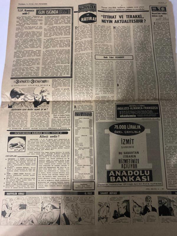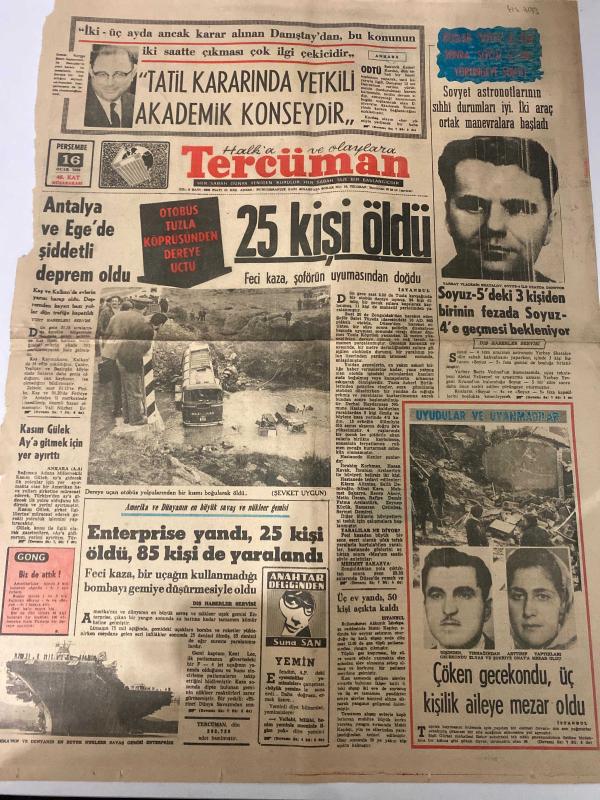 TERCÜMAN GAZETESİ - 16 OCAK 1969 - SADECE 2 SAYFADIR -Kasım Gülek-Şevket Uygun-Suna San-Ahmet Kabaklı-Halit Fahri Ozansoy-Zelyut A. Menüt-Şükrü Baban-O. Filiz “Tatil kararında yetkili akademik konseyidir”-Antalya ve Ege’de şiddetli deprem oldu-Otobüs Tuzla köprüsünden dereye uçtu 25 kişi öldü-Sovyet astronotlarının sıhhî durumları iyi, iki araç ortak manevralara başladı-Soyuz-5’deki 3 kişiden birinin fezada Soyuz-4’e geçmesi bekleniyor-Enterprise yandı 25 kişi öldü 85 kişi de yaralandı-Çöken gecekondu üç kişilik aileye mezar oldu-Gong Biz de atarız-Anahtar Deliğinden-Yemin-Gün ışığında TİP komünist midir?-Sanat ve Hatırat İttihat ve Terakki neyin aktualitesidir?-3 sual 3 cevap-Doktor Kamran Senel diyor ki: Alerji nedir?-Dış politika-Beyrut’taki kabine buhranı sürüyor Hafiyeler Kralı-O. Filiz-Saadet Rüyası-çizer imzası D. Wright adlı eser, Kitap > Süreli Yayınlar > Gazeteler > Türkiye > Genel > Günlük kategorisinde İkinci El olarak satıştadır.