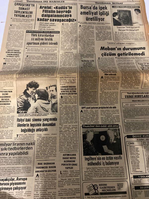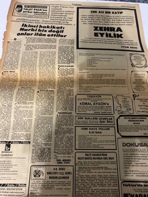 TERCÜMAN GAZETESİ - 16 ŞUBAT 1983 - SAYI:76- (Turkish Newspaper) - Sadece Arkalı Önlü Tek Yapraktır - Bir Devir Aydınlanıyor - Talat Paşa’nın Gurbet Hatıraları-Talat Paşa-Zehra Eyilik-Kemal Aygün-İlyas Tekin-Münir Bellek-Thatcher-Richard Green-Arafat-Tahir Hakicadiroğlu-İkinci hakikat:Harbi biz değil onlar ilan ettiler-ÇOK ACI BİR KAYIP-TEŞEKKÜR-DİNİ SUALLERE CEVAPLAR-TÜRK HAVA YOLLARI A.O.'DAN-MALİYE BAKANLIĞI'NDAN-D.B. DENİZ NAKLİYATI T.A.Ş. GENEL MÜDÜRLÜĞÜNDEN-DOKUSA-Arafat: "Kudüs'e Filistin bayrağı dalgalanıncaya kadar savaşacağız"-Bursa'da ipek ameliyat ipliği üretiliyor-Meban'ın durumuna çözüm getirilemedi-İtalya'daki sinema yangınında ölenlerin hepsinin dumandan boğulduğu anlaşıldı-İngiltere'nin en üstün vasıflı mühendisi iş bulamıyor-CAVUŞESKU'YA SUİKAST SÖYLENTİLERİ YAYGINLAŞTI-ALMAN EVSAHİBİ REKOR PEŞİNDE-SOVYET SAVAŞ GEMİLERİ AMERİKA YAKINLARINDA TATBİKAT YAPTI-KİPRİYANU'NUN SEÇİMİ KAZANMASI EN FAZLA MOSKOVA'YI SEVİNDİRDİ-100 milyar liranın nakli çok sıkı tedbirlerden sonra adlı eser Türkçe dilindedir.