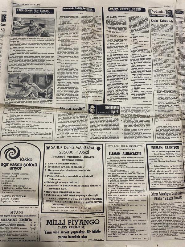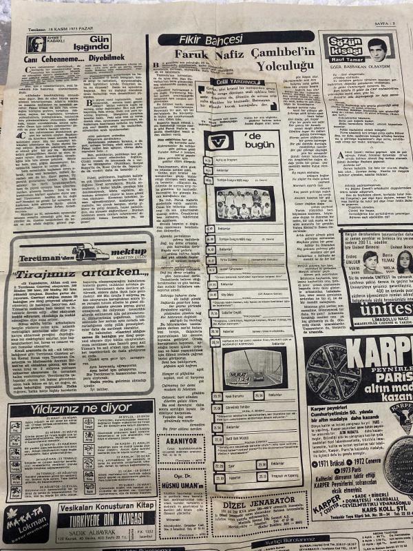 TERCÜMAN GAZETESİ - 18 KASIM 1973 - SADECE 8 SAYFADIR -Yasin-Alpaslan-Özer-Tuncay-Zekeriya-Bülent-Ziya-Mehmet-B.Mehmet-Cemil-Mehmet-Vali-Taner-İl İnsaf Grader-Aydın Irgen-Osman Ekinci-Metin Oktay-Hakkı Yeten-Ertuğrul Sağlam-İhsan Çıpıl-Ethem Koçu-Tevfik Ünsi-Lütfü Küçükosmanoğlu-İhsan Tayyar-Necati Polat-Fuat Gözalan-Necati Yücel-Celal Yardımcı-Ahmet Kabaklı-Faruk Nafiz Çamlıbel-Rauf Tamer-Yılmaz Akkılıç-Sadık Albayrak-İbrahim Minnetoğlu-Şükrü Ayhan-Debrili Hasan-Murat Atılgan-Hüsnü Uman-Sabahattin Emir-Sait Elik-Menmet Karan-Selim Cupil-Suat Ünal-İhsan Önder-Ziya Küçük-Erdemir-Doğan Bebeğe-AP Lideri Demirel-DP Adayı Erdoğan-Büyük Dersane Milli Takımımız İzmir’in Atatürk Stadında İsviçre karşısına final yolunu açabilecek bir mücadeleye çıkıyor-Dünya Kupası Son Eleme Maçı İçin Tek Dilek-Bir İkincilik ver-Kritik bölge orta sahadır-Genç Milli Takım Kadrosu Açıklandı-Eksik Beşiktaş, Tiflis Dinamosuna 1-0 yenildi-Bir hakem böyle bıraktı-Üsküdar’ın yetiştirdiği bir büyük adam-İlk yarı lider adlı eser, Kitap > Süreli Yayınlar > Gazeteler > Türkiye > Genel > Günlük kategorisinde İkinci El olarak satıştadır.