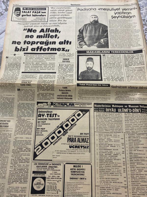 TERCÜMAN GAZETESİ - 19 ARALIK 1982 - SAYI:17 - (Turkish Newspaper) - Sadece Arkalı Önlü Tek Yapraktır - Bir Devir Aydınlanıyor - Talat Paşa’nın Gurbet Hatıraları -Ahmet Midhat-Ahmet Raşit (Rey)-Ahmet Selahattin-Baha Tevfik-Bahaddin Şakir-Cemal Kutay-Cemaleddin Efendi-Dr. Eczacıbaşı-Dr. Güngör Uras-Edibe Dolu-Ergür-F. N. Kuşçubaşı-Hasan Hayri-Hüseyin Yıldız-Kamil Paşa-Leblebicioğlu-M. Şevket Eygi-Mehmet Celat-Mehmet Emre-Mehmet Reşat-Mithat Paşa-Münif Paşa-N. Fazıl Kısakürek-Ömer Naci-Padişah-Sabahat Emir-Sait Halim Paşa-Sultan Hamid-Şeyhülislam-Talat Paşa-Ümit-Uras-"1983, ekonomik ümit yılı,"-"ARKADAŞLAR, TOPRAK BİZİ KABUL ETMEZ..."-"Bizi meşrutiyetin sahibi gören millet, bizden vaad ettiğimiz şeylerin yerine getirilmesini istiyor. Bizi, bu hizmetleri yapacak mevki ve mes’uliyette bulmak arzu ve ihtiyacındadır. “Ne Allah, ne millet, ne toprağın altı bizi affetmez„"-"Hem gemicilik teşvik ediliyor, hem yüzde 5 rıhtım resmi alınıyor"-"MÜJDE! ARTIK BAŞARILI KOMPOZİSYON YAZACAKSINIZ"-"Özel adlı eser, Kitap > Süreli Yayınlar > Gazeteler > Türkiye > Genel > Günlük kategorisinde İkinci El olarak satıştadır.