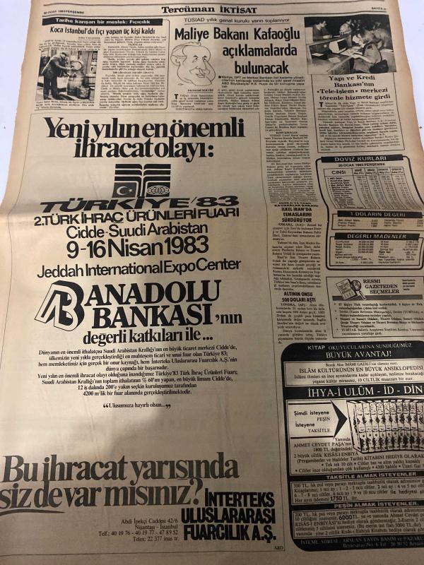 TERCÜMAN GAZETESİ - 20 OCAK 1983 - SAYI:49 - (Turkish Newspaper) - Sadece Arkalı Önlü Tek Yapraktır - Bir Devir Aydınlanıyor - Talat Paşa’nın Gurbet Hatıraları-Ahmet Cevat Paşa-Adnan Başer Kafaoğlu-Akgünler-Alpaslan Çağlayan-Aysel Polatay-Atilla Erman-C. Gounod-Cahit Özkan-Cemal Kutay-Dr. Ismet Gürpınar-Dr. Necdet Okan-Dr. Semih Abbasoğlu-Dr. Şükrü Tokatlıoğlu-Fatma Aydemir-G. Puccini-H. Schmidt-J. Strauss-M. Alpaslan Çağlayan-M. Cahit Özkan-M. Zafer Çağlayan-Mahmud Şevket Paşa-Metin Temiz-Mithad Şükrü-R.B. Hupe-Sait Paşa-Selahattin Bey-Şenol Yokselsen-Talat Paşa-Koca Istanbul'da fıçı yapan üç kişi kaldı-Maliye Bakanı Kafaoğlu açıklamalarda bulunacak-TÜSİAD yıllık genel kurulu yarın toplanıyor-Yeni yılın en önemli ihracat olayı:-TÜRKİYE '83-ANADOLU BANKASI'nın değerli katkıları ile...-Bu ihracat yarışında siz de var mısınız?-DOVİZ KURLARI-1 DOLARIN DEĞERİ-DEĞERLİ MADENLER-RESMİ GAZETEDEN SEÇMELER-KITAP OKUYUCULARINA SUNDUĞUMUZ BÜYÜK AVANTAJ!-İHYA-İ ULÛM - İD - DİN-Bir devir aydınlanıyo adlı eser Türkçe dilindedir.