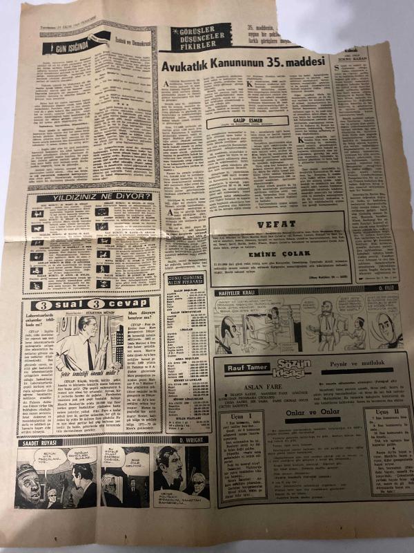 TERCÜMAN GAZETESİ - 23 EKİM 1969 - SADECE 2 SAYFADIR -Ahmet Kabaklı-Demirel-Ahmet-Galip Esmer-Emine Çolak-Sükrü Baban-Zeyyat Selimoğlu-Rauf Tamer-O. Filiz-D. Wright-Suna San Türkiye’de başbakanlar ve Cumhuriyet Hükûmetleri-Meclis ve Senato açıldı-Yemin ettiler “Namusum üzerine…”-Bir genç kızın kalbi ve nefes borusu değiştirildi-Hasmını gaz dökerek yaktı-Orta-Doğu’da kolera görüldü-Somali kabinesi tevkif edildi-Anamur’da yağmur yüzünden denizle ova birleşti, 5 ölü var-Küçük Ahmet, okula gitmek için bir “mucize” bekliyor-Görüşler Düşünceler Fikirler-Avukatlık Kanununun 35. maddesi-Vefat-Gün ışığında-İslami ve Demokrasi-Yıldızınız ne diyor-3 sual 3 cevap-Hafiyeler Kralı-Sözün kısası Peynir ve mutluluk-Onlar ve Onlar Saadet Rüyası-D. Wright-Aslan Fare-Rauf Tamer