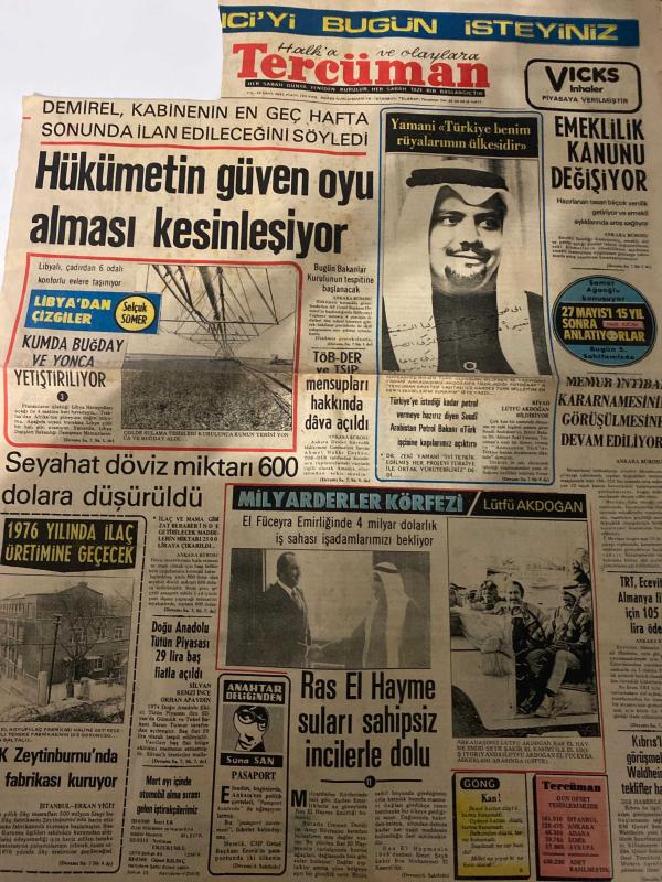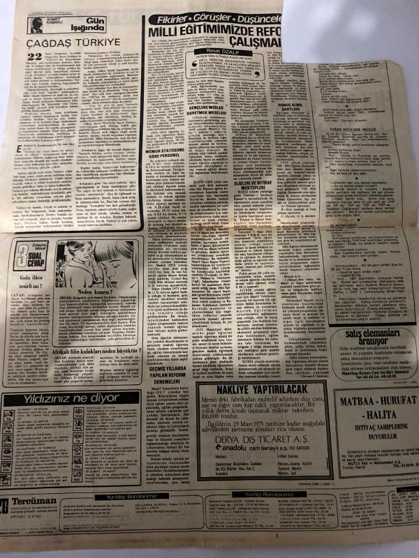 TERCÜMAN GAZETESİ - 25 MART 1975 - SADECE 2 SAYFADIR -Demirel-Yamani-Selçuk Sömer-Lütfü Akdoğan-Suna San-Erkan Yiğit-Kemal Ilıcak-Ahmet Kabaklı-Resat Özalp-Turan Hükümetin güven oyu alması kesinleşiyor-Yamani: Türkiye benim rüyalarım ülkesidir-Emeklilik kanunu değişiyor-Kumda buğday ve yonca yetiştiriliyor-TÖB-Der ve TSİP mensupları hakkında dava açıldı-Seyahat döviz miktarı 600 dolara düşürüldü-1976 yılında ilaç üretimine geçecek-Doğu Anadolu Tütün Piyasası 29 lira baş fiyatla açıldı-Merter’de yeni sınai işyerleri açılacak-Zeytinburnu’nda fabrika kuruyor-Ras El Hayme suları sahipsiz incilerle dolu-Milyarderler Körfezi-El Füceyre Emirliğinde 4 milyar dolarlık iş sahası işadamlarımızı bekliyor-Gün Işığında Çağdaş Türkiye-3 Sual 3 Cevap-İstiridye incisinin şifalı tesiri mi-Neden kızarız-Afrikalı filin kulakları neden büyüktür-Yıldızınız ne diyor-Fikirler Görüşler Düşünceler-Milli eğitimimizde reform çalışmaları-Geçmiş yıllarda yapılan reform denemeleri-Gençler meslek öğretmek meselesi-M adlı eser, Kitap > Süreli Yayınlar > Gazeteler > Türkiye > Genel > Günlük kategorisinde İkinci El olarak satıştadır.