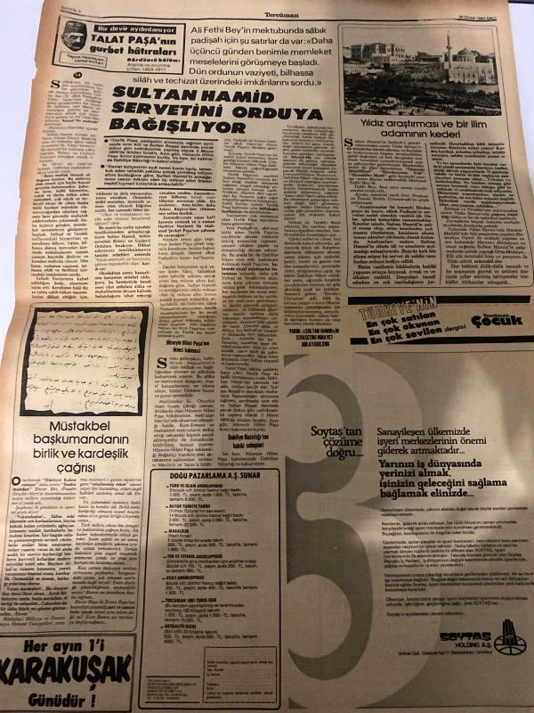 TERCÜMAN GAZETESİ - 25 OCAK 1983 - SAYI:54 - (Turkish Newspaper) - Sadece Arkalı Önlü Tek Yapraktır - Bir Devir Aydınlanıyor - Talat Paşa’nın Gurbet Hatıraları-Ahmet Cemil Akıncı-Ali Fethi Bey-Cemal Kutay-Enver Paşa-Hüseyin Hilmi Paşa-İbn-i Abidin-İsmail Hakkı Uzunçarşılı-Mahmud Es’ad-Mehmed Tahir Bey-Mehmet Alıcı-Ömer Rıza Paşa-Prof. Türk-Sait Paşa-Sultan Hamid-Sultan Reşad-Talat Paşa-Tevfik Paşa-Sultan Hamid servetini orduya bağışlıyor-Yıldız araştırması ve bir ilim adamının kederi-Müstakbel başkumandanın birlik ve kardeşlik çağrısı-Bankalar, menkul kıymet alım-satımı yapabilecek-1982’de zarar eden KİT sayısı 3’e düştü-Oto tamircileri: “Yedek parçalar kalitesiz,,-OPEC toplantısı hiçbir karar alınamadan dağıldı-Faiz gelirleri ve verginiz-Ulaştırma Bakanlığı, Gürbulak’ta bekleyen araçlarla ilgili açıklama yaptı-Renault Fabrikası frenleri tutmayan 100 bin arabasını piyasadan toplatıyor-Sönmez Holding bu yıl 5 milyar liralık yatırım yapacak-Gurbet hatıraları-Dördüncü bölüm: Arama ve avun adlı eser, Kitap > Süreli Yayınlar > Gazeteler > Türkiye > Genel > Günlük kategorisinde İkinci El olarak satıştadır.