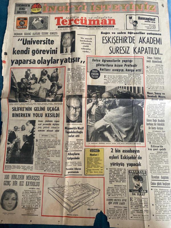 TERCÜMAN GAZETESİ - 26 MAYIS 1970 - SADECE 2 SAYFADIR -Demirel-Doğan Porson-Nazif Tepedelenlioğlu-Ferhunde Sarıhan-Suna San-Rauf Tamer-Ulvi Yenal-Şükrü Baban Üniversite kendi görevini yaparsa olaylar yatışır-Eskişehir’de Akademi süresiz kapatıldı-Silifke’nin gelini uçağa binerken yolu kesildi-Nazif Tepedelenlioğlu vefat etti-100 binlerin mirasçısı genç bir kız kayboldu-Albayların gölgesinde-2 bin assubayın eşleri Eskişehir’de yürüyüş yapacak-Zeytinyağı skandalı dürüst-vergiler personel kanunu ve Türk-İş Kongresi-Bıktık bıktık artık yeter bu hayat heyhat-Sözün kısası Karikatür: D. Wright-Bob Sawyer’in Maceraları-R. Crane-Saadet Rüyası adlı eser, Kitap > Süreli Yayınlar > Gazeteler > Türkiye > Genel > Günlük kategorisinde İkinci El olarak satıştadır.
