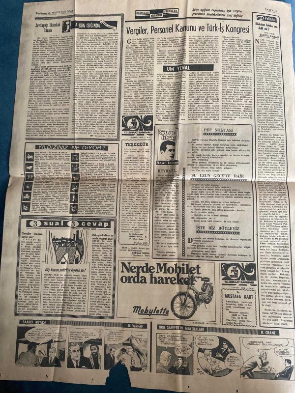 TERCÜMAN GAZETESİ - 26 MAYIS 1970 - SADECE 2 SAYFADIR -Demirel-Doğan Porson-Nazif Tepedelenlioğlu-Ferhunde Sarıhan-Suna San-Rauf Tamer-Ulvi Yenal-Şükrü Baban Üniversite kendi görevini yaparsa olaylar yatışır-Eskişehir’de Akademi süresiz kapatıldı-Silifke’nin gelini uçağa binerken yolu kesildi-Nazif Tepedelenlioğlu vefat etti-100 binlerin mirasçısı genç bir kız kayboldu-Albayların gölgesinde-2 bin assubayın eşleri Eskişehir’de yürüyüş yapacak-Zeytinyağı skandalı dürüst-vergiler personel kanunu ve Türk-İş Kongresi-Bıktık bıktık artık yeter bu hayat heyhat-Sözün kısası Karikatür: D. Wright-Bob Sawyer’in Maceraları-R. Crane-Saadet Rüyası, Kemal Ilıcak tarafından kaleme alınmıştır. TERCÜMAN GAZETESİ - 26 MAYIS 1970 - SADECE 2 SAYFADIR -Demirel-Doğan Porson-Nazif Tepedelenlioğlu-Ferhunde Sarıhan-Suna San-Rauf Tamer-Ulvi Yenal-Şükrü Baban Üniversite kendi görevini yaparsa olaylar yatışır-Eskişehir’de Akademi süresiz kapatıldı-Silifke’nin gelini uçağa binerken yolu kesildi-Nazif Tepedelenlioğlu vefat etti-100 binlerin mirasçısı genç bir kız kayboldu-Albayların gölgesinde-2 bin assubayın eşleri Eskişehir’de yürüyüş yapacak-Zeytinyağı skandalı dürüst-vergiler personel kanunu ve Türk-İş Kongresi-Bıktık bıktık artık yeter bu hayat heyhat-Sözün kısası Karikatür: D. Wright-Bob Sawyer’in Maceraları-R. Crane-Saadet Rüyası adlı eser Türkçe dilindedir. Eserin içeriğinde Türkçe dilinde bölümlere de yer verilmektedir.