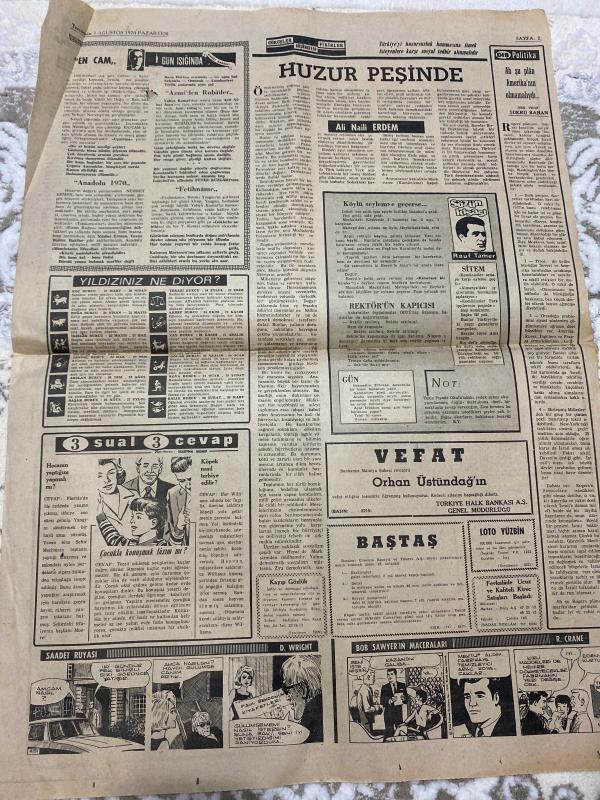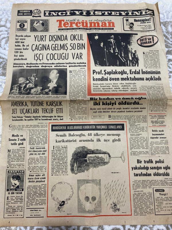 TERCÜMAN GAZETESİ - 3 AĞUSTOS 1970 - SADECE 2 SAYFADIR -Prof. Şapalakoğlu-Erdal İnönü-Semih Balcıoğlu-Yaşar Güngör-Suna San-Ali Naili Erdem-Rauf Tamer-Orhan Üstündağ-D. Wright-R. Crane-Yurt dışında okul çağına gelmiş 50 bin işçi çocuğu var-Prof. Şapalakoğlu Erdal İnönü’nün kendini öven mektubunu açıkladı-Amerika tütüne karşılık jet uçakları teklif etti-Medis ve Senato 3 aylık tatile girdi-Trafik kazasında intihar eden beş kişi öldü-Orman yolları altı kanun tasarısı bu hafta Mecliste görüşülecek-Bir kadın ve oğlu iki kişiyi öldürdü-Bir trafik polisi yakaladığı sanığın oğlu tarafından öldürüldü-Semih Balcıoğlu 48 ülkeye mensup karikatürist arasında ilk üçe girdi-ODTÜ’de buhran-Huzur peşinde-Sitem-3 sual 3 cevap-Yıldızınız ne diyor?-Saadet Rüyası-Bob Sawyer’in Maceraları adlı eser, Kitap > Süreli Yayınlar > Gazeteler > Türkiye > Genel > Günlük kategorisinde İkinci El olarak satıştadır.