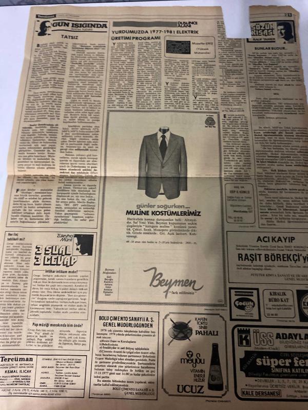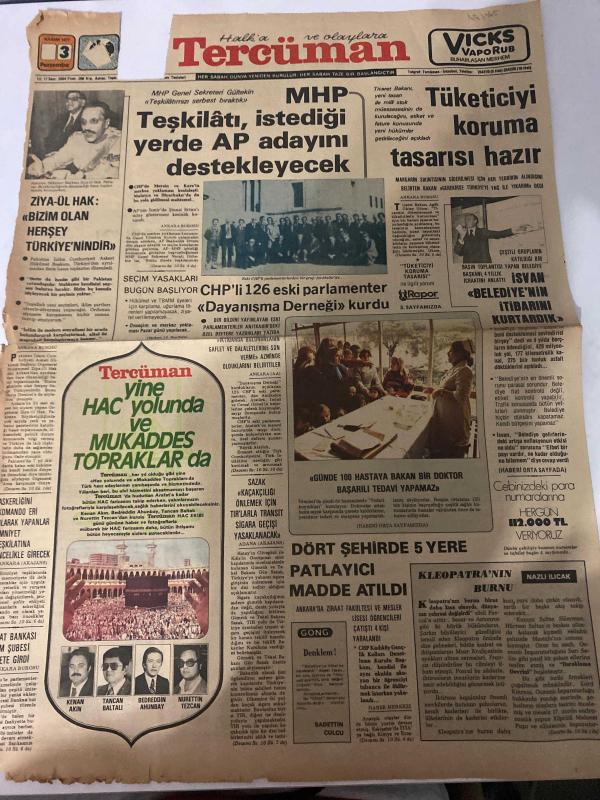 TERCÜMAN GAZETESİ - 3 KASIM 1977 - SADECE 2 SAYFADIR -Ziya-ül Hak-Kenan Akın-Tancan Baltalı-Bedreddin Arunbay-Nurettin Tezcan-Ahmet Kabaklı-Muzaffer Eriş-Rauf Tamer-Züleyha Munis-Nazlı Ilıcak-Kemal Ilıcak-Sadettin Çulcu MHP teşkilatı istediği yerde AP adayını destekleyecek-Tüketiciyi koruma tasarısı hazır-Ziya-ül Hak: “Bizim olan her şey Türkiye’nindir”-CHP’li 126 eski parlamenter “Dayanışma Derneği” kurdu-Dört şehirde beş yere patlayıcı madde atıldı-Günde 100 hastaya bakan bir doktor başarılı tedavi yapamaz-Tercüman yine hac yolunda ve mukaddes topraklarda-Sazak: “Kaçakçılığı önlemek için tırlarla transit sigara geçişi yasaklanacak”-Kleopatra’nın burnu-MHP teşkilatı serbest bırakıldı-Tatsız-Yurdumuzda 1977-1981 elektrik üretimi programı-Bunlar budur-3 sual 3 cevap-İntihar istikameti nedir?-Pop müziği merakında kim önde?-Gong: Denklem!-Acı kayıp: Raşit Börekçi öldü adlı eser, Kitap > Süreli Yayınlar > Gazeteler > Türkiye > Genel > Günlük kategorisinde İkinci El olarak satıştadır.