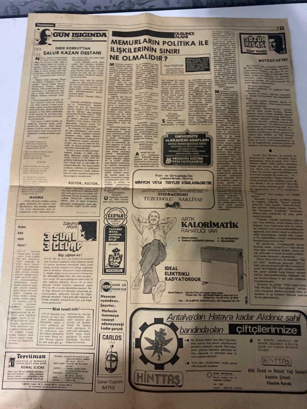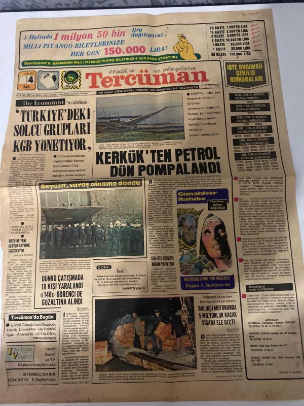 TERCÜMAN GAZETESİ - 4 OCAK 1977 - SADECE 2 SAYFADIR -Süleyman Demirel-Ahmet Kabaklı-Nuri Torop-Rauf Tamer-Züleyha Munis-Sadettin Çulcu-Ayhan Başoğlu-Kemal Ilıcak Türkiye’deki solcu grupları KGB yönetiyor-Kerkük’ten petrol dün pompalanadı-Dünkü çatışmada 10 kişi yaralandı 148 öğrenci de gözaltına alındı-Balıkçı motorunda 5 milyonluk kaçak sigara ele geçti-ODTÜ’ye yeni rektör tayinine çalışılıyor-The Economist’in iddiası-Demirel: «Bu eser büyük bir eserdir»-Beyazıt savaş alanına döndü-Ter-oto çekilişi bugün yapılıyor-Gong: Terfi!-Memurların politika ile ilişkilerinin sınırı ne olmalıdır?-Dede Korkut’tan Salur Kazan Destanı-Boykot ve tertip-3 sual 3 cevap-Neden kışın nezle olursun?-Bilgi çoğalıyor mu?-Böcek kuvvetli midir?-Günahkâr Rahibe-Milli piyango biletlerinize her gün 150.000 lira-Tercüman’a bakmadan milli piyango yılbaşı biletinizi 4 gün daha atmayınız-İşte bugünkü çekiliş numaraları Karikatür:Günahkâr Rahibe-Çizer:Ayhan Başoğlu adlı eser, Kitap > Süreli Yayınlar > Gazeteler > Türkiye > Genel > Günlük kategorisinde İkinci El olarak satıştadır.