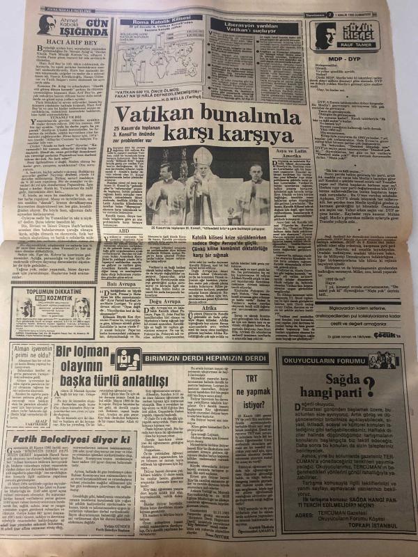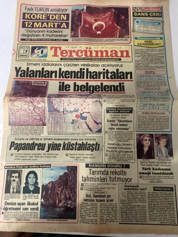 TERCÜMAN GAZETESİ - 7 ARALIK 1985 - SADECE 2 SAYFADIR -Faik Türün-Ergun Göze-Ecevit-Halef oğlu-Sema Özal-Lejla Türkeş Kayalıoğlu-Ahmet Kabaklı-Rauf Tamer-Hacı Arif Bey-Nazlı Ilıcak-Sabri Çetiner-Papandreu-Özal-Türk Kadın Vakfı-Vatikan Katolik Kilisesi-Hacı Arif Bey-Yalanları kendi haritaları ile belgelendi-Papandreu yine küstahlaştı-Denize uçan ilkokul öğretmeni can verdi-Tarımda rekolte tahminleri tutmuyor-Özal Hamitabad gaz santralını hizmete açıyor-Türk kadınının emeği tanıtılacak-İnanmak mümkün mü-Vatikan bunalımla karşı karşıya-MDP DYP-Bir lojman olayının başka türlü anlatılışı-TRT ne yapmak istiyor-Sağda hangi parti adlı eser, Kitap > Süreli Yayınlar > Gazeteler > Türkiye > Genel > Günlük kategorisinde İkinci El olarak satıştadır.