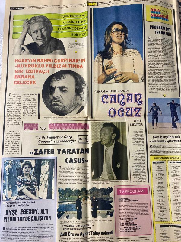 TERCÜMAN GAZETESİ - 8 EYLÜL 1977 - SADECE 4 SAYFADIR -Cem Serdengeçti-Osman Saraç-Mehmet Kervancı-Emine İşinsu-Senol Kırpıkçioğlu-Murat Bertuğ-Güngör Kabakoğlu-Hüseyin Rahmi Gürpınar-Canan Oğuz-Ayşe Egesoy-Adil Örs-Aykut Taluy-Lili Palmer-Gary Cooper-Cemil Meriç-Cemil Koçak-Afrikanın ortasında küçücük bir krallık Allahıyla başbaşa yaşıyor-Ülfet-Ramazan sohbetleri-Yeni Bedir zaferlerine doğru-Gençler için din dersleri-Zekat-Can İçre Şeytan Kuyusu-Karagöz Hacivat 77-Eskiden adımız dinleyici idi şimdi seyirci olduk-Hüseyin Rahmi Gürpınar’ın Kuyruklu yıldız altında bir izdivaç eseri ekrana gelecek-Canan Oğuz Zafer yaratan casus-Ayşe Egesoy altı yıldır TRT’de çalışıyor-Adil Örs ve Aykut Taluy evlendi, Kemal Ilıcak tarafından kaleme alınmıştır. TERCÜMAN GAZETESİ - 8 EYLÜL 1977 - SADECE 4 SAYFADIR -Cem Serdengeçti-Osman Saraç-Mehmet Kervancı-Emine İşinsu-Senol Kırpıkçioğlu-Murat Bertuğ-Güngör Kabakoğlu-Hüseyin Rahmi Gürpınar-Canan Oğuz-Ayşe Egesoy-Adil Örs-Aykut Taluy-Lili Palmer-Gary Cooper-Cemil Meriç-Cemil Koçak-Afrikanın ortasında küçücük bir krallık Allahıyla başbaşa yaşıyor-Ülfet-Ramazan sohbetleri-Yeni Bedir zaferlerine doğru-Gençler için din dersleri-Zekat-Can İçre Şeytan Kuyusu-Karagöz Hacivat 77-Eskiden adımız dinleyici idi şimdi seyirci olduk-Hüseyin Rahmi Gürpınar’ın Kuyruklu yıldız altında bir izdivaç eseri ekrana gelecek-Canan Oğuz Zafer yaratan casus-Ayşe Egesoy altı yıldır TRT’de çalışıyor-Adil Örs ve Aykut Taluy evlendi adlı eser Türkçe dilindedir. Eserin içeriğinde Türkçe dilinde bölümlere de yer verilmektedir.