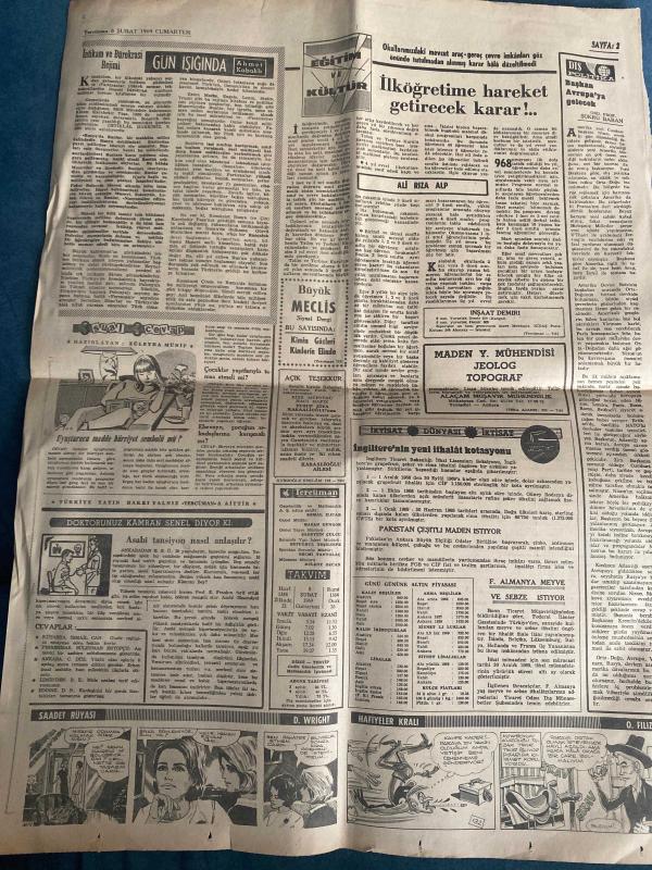 TERCÜMAN GAZETESİ - 8 ŞUBAT 1969 - SADECE 2 SAYFADIR -Nazlı Ilıcak-Tarık Güray-Erkanlı-Metin Toker-Suna San-Cemal Bayraktar-Ahmet Kabaklı-Ali Rıza Alp-Kamran Şenel-D. Wright-O. Filiz-Casım Aker-Emekli maaşları yüzde 70’e çıktı-Komünizm vatandan sökülüp atılacaktır-Kâbe’ye yüz sürenler-Tural temsilciliğe veya askeri şura üyeliğine seçilecek-Yeni vergi tasarısı Meclis’te-Ausein’da üniversite talebesi intihar etti-1 kadın ile 2 çocuğu bıçakla delik deşik edilip öldürüldü-Akhisar’da taş ve sopalı şoför kavgası-Pendik lisesinde okuyan bir kız öğrenci kaçırıldı-176 devletten sadece 14’ünün borcu yok-Gong-Tural gidiyor-Tural geliyor-Tural mı?-Asıl gibi dir-Çamaşır deterjanında hileli imalat-Çamaşır deterjanı zehir gibi-Çamaşır deterjanı hileli imalatla alıcıya sunuldu-İlköğretime hareket getirecek karar-İnkılap ve bürokrasi rejimi-Gün Işığında-Asabi tansiyonu nasıl anlaşılır-Çocuklar yataklarını ıslatıyor mu?-Asabi tansiyonu nasıl anlaşılır-Saadet Rüyası-D. Wright-Hafiyeler Kralı-O. Filiz adlı eser, Kitap > Süreli Yayınlar > Gazeteler > Türkiye > Genel > Günlük kategorisinde İkinci El olarak satıştadır.