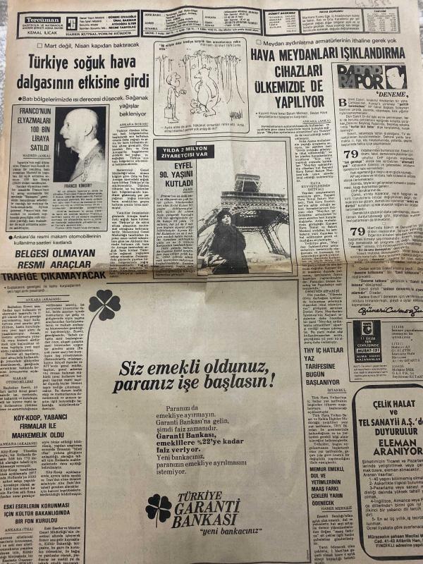 TERCÜMAN GAZETESİ - DOĞUM GÜNÜ HEDİYESİ (TURKISH NEWSPAPPER) - 1 NİSAN 1979 - SADECE TEK YAPRAKTIR -Kemal Ilıcak-Oğuzhan Asiltürk-Necmi Tanyolaç-Mukbil Özyörük-Necdet Calp-Ecevit-Rauf Tamer-Ahmet Kabaklı-Türkiye soğuk hava dalgasının etkisine girdi-Franconun elyazmaları 100 bin liraya satıldı-Belgesi olmayan resmi araçlar trafiğe çıkamayacak-Köykoop yabancı firmalar ile mahkemelik oldu-Eski eserlerin korunması için Kültür Bakanlığında bir fon kuruldu-Hava meydanları ışıklandırma cihazları ülkemizde de yapılıyor-Yılda 2 milyon ziyaretçisi var Eyfel 90 yaşını kutladı-THY iç hatlar yaz tarifesine bugün başlanıyor-Asgari ücret vergi dışı kalmalıdır-Duyuru-Karar sizin-Basın susarsa-İşçi düşmanı CHP hükümeti-Sosyal güvenlik köşesi-Kongre ilanı-Cephe elemanı montaj vinci yaptırılacaktır-Muhasebe Enstitüsünden Ankara İktisadi ve Ticari İlimler Akademisi-Satılık büro-İlan-Satılık sansum ve depolar-Bağfaş Bandırma Gübre Fabrikaları A Ş nin sayın ortak ve tahvil sahiplerine rüçhan haklarını kulla, Kemal ılıcak tarafından kaleme alınmıştır. TERCÜMAN GAZETESİ - DOĞUM GÜNÜ HEDİYESİ (TURKISH NEWSPAPPER) - 1 NİSAN 1979 - SADECE TEK YAPRAKTIR -Kemal Ilıcak-Oğuzhan Asiltürk-Necmi Tanyolaç-Mukbil Özyörük-Necdet Calp-Ecevit-Rauf Tamer-Ahmet Kabaklı-Türkiye soğuk hava dalgasının etkisine girdi-Franconun elyazmaları 100 bin liraya satıldı-Belgesi olmayan resmi araçlar trafiğe çıkamayacak-Köykoop yabancı firmalar ile mahkemelik oldu-Eski eserlerin korunması için Kültür Bakanlığında bir fon kuruldu-Hava meydanları ışıklandırma cihazları ülkemizde de yapılıyor-Yılda 2 milyon ziyaretçisi var Eyfel 90 yaşını kutladı-THY iç hatlar yaz tarifesine bugün başlanıyor-Asgari ücret vergi dışı kalmalıdır-Duyuru-Karar sizin-Basın susarsa-İşçi düşmanı CHP hükümeti-Sosyal güvenlik köşesi-Kongre ilanı-Cephe elemanı montaj vinci yaptırılacaktır-Muhasebe Enstitüsünden Ankara İktisadi ve Ticari İlimler Akademisi-Satılık büro-İlan-Satılık sansum ve depolar-Bağfaş Bandırma Gübre Fabrikaları A Ş nin sayın ortak ve tahvil sahiplerine rüçhan haklarını kulla adlı eser Türkçe dilindedir.