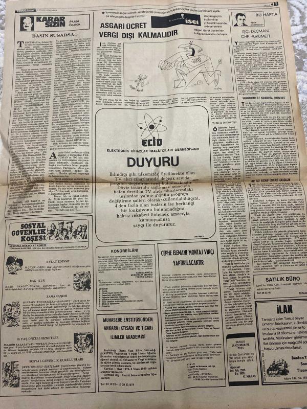 TERCÜMAN GAZETESİ - DOĞUM GÜNÜ HEDİYESİ (TURKISH NEWSPAPPER) - 1 NİSAN 1979 - SADECE TEK YAPRAKTIR -Kemal Ilıcak-Oğuzhan Asiltürk-Necmi Tanyolaç-Mukbil Özyörük-Necdet Calp-Ecevit-Rauf Tamer-Ahmet Kabaklı-Türkiye soğuk hava dalgasının etkisine girdi-Franconun elyazmaları 100 bin liraya satıldı-Belgesi olmayan resmi araçlar trafiğe çıkamayacak-Köykoop yabancı firmalar ile mahkemelik oldu-Eski eserlerin korunması için Kültür Bakanlığında bir fon kuruldu-Hava meydanları ışıklandırma cihazları ülkemizde de yapılıyor-Yılda 2 milyon ziyaretçisi var Eyfel 90 yaşını kutladı-THY iç hatlar yaz tarifesine bugün başlanıyor-Asgari ücret vergi dışı kalmalıdır-Duyuru-Karar sizin-Basın susarsa-İşçi düşmanı CHP hükümeti-Sosyal güvenlik köşesi-Kongre ilanı-Cephe elemanı montaj vinci yaptırılacaktır-Muhasebe Enstitüsünden Ankara İktisadi ve Ticari İlimler Akademisi-Satılık büro-İlan-Satılık sansum ve depolar-Bağfaş Bandırma Gübre Fabrikaları A Ş nin sayın ortak ve tahvil sahiplerine rüçhan haklarını kulla adlı eser, Kitap > Süreli Yayınlar > Gazeteler > Türkiye > Genel > Günlük kategorisinde İkinci El olarak satıştadır.