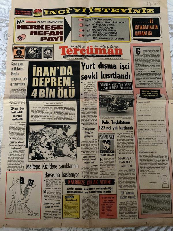 TERCÜMAN GAZETESİ - DOĞUM GÜNÜ HEDİYESİ (TURKISH NEWSPAPPER) - 11 NİSAN 1972 - SADECE TEK YAPRAKTIR-Süleyman Demirel-Kemal Satır-Kemal Demir-Necdet Uğur-Nail Erdem-Suna San-Liya Yılmaz-Adnan Menderes-Yüksel Menderes-Enver Sedat-Pehlevi-Hilmi İşgüzar-Munir Nurettin Selçuk-Hikmet Eroz-Prof Dr Hüseyin Nail Kubalı-Ahmet Kabaklı-Rauf Tamer-Ulvi Yenal-Prof Dr Bedii N Şehsuvaroğlu-Dr Fuat Turnaoğlu-Mustafa ve Ömer Yalçın-Demirel En mühim mesele pahalılıktır-CHPde bitmeyen kavga-Ecevit aleyhtarları artık kesin bir çözüm istiyorlar-9 Murat çekilişinin ilk konseri bu akşam-Irmaklar dondu Doğu illeri ile irtibat kesildi-Kasaplar et derdini Danıştaya götürdüler-En başarılı trafik polisi seçilen iki hanıma birer çift çorap hediye edildi-Bu meydanda nice başlar-Yurdumuzun kalkınması yatırımlara bağlıdır-Avrupada bir Müzik Elçimiz-57 subay 11 assubay ordudan ihraç edildi-Para darlığı Boğaz Köprüsünü geciktiriyor-İpraş Rafinerisi Türk malı oldu-İranda deprem 4 bin ölü-Yurt dışına işçi sevki kısıtland adlı eser Türkçe dilindedir.
