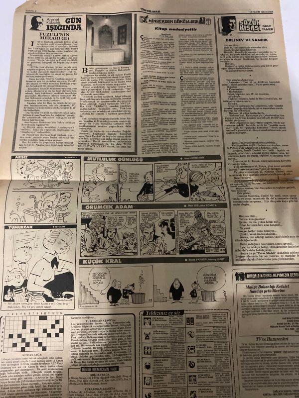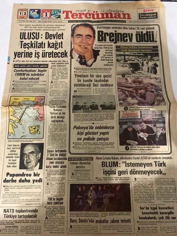 TERCÜMAN GAZETESİ - DOĞUM GÜNÜ HEDİYESİ (TURKISH NEWSPAPPER) - 12 KASIM 1982 - SADECE İKİ SAYFADIR -Leonid Brejnev-Andreas Papandreu-Ahmet Kabaklı-Rauf Tamer-Kurtul Altuğ-Zeynep Göğüş-Lynn Johnston-Brant Parker-Johnny Hart-Ulusu devlet teşkilatı kağıt yerine iş üretecek-Brejnev öldü-Dünya tarihine komünizmin kanlı damgasını vurmuştu-Yönetimin bir süre geçici bir komite tarafından yürütüleceği ileri sürülüyor-Polonyada onbinlerce kişi gösteri yaptı ve polisle çatıştı-Blum istemeyen Türk işçisi geri dönmeyecek-Papandreu bir darbe daha yedi-Nato toplantısında Türkiye tartışılacak-Siyasi tartışmada 2 Türkün öldüğü Alman kasabasında yeni olaylara karşı tedbir alındı-Barış davasında avukatlar salonu terketti-Surda işgal kuvvetleri komutanlık karargahı bombalandı çok ölü-Gün ışığında Fuzulinin mezarı-Minberden gönüllere kitap medeniyettir-Sözün kısası Brejnev ve sandık-Arsız-Mutluluk günlüğü-Örümcek adam-Yumurcak-Küçük kral-Yıldızınız ve siz-TV ve huzurevleri, Kemal Ilıcak tarafından kaleme alınmıştır. TERCÜMAN GAZETESİ - DOĞUM GÜNÜ HEDİYESİ (TURKISH NEWSPAPPER) - 12 KASIM 1982 - SADECE İKİ SAYFADIR -Leonid Brejnev-Andreas Papandreu-Ahmet Kabaklı-Rauf Tamer-Kurtul Altuğ-Zeynep Göğüş-Lynn Johnston-Brant Parker-Johnny Hart-Ulusu devlet teşkilatı kağıt yerine iş üretecek-Brejnev öldü-Dünya tarihine komünizmin kanlı damgasını vurmuştu-Yönetimin bir süre geçici bir komite tarafından yürütüleceği ileri sürülüyor-Polonyada onbinlerce kişi gösteri yaptı ve polisle çatıştı-Blum istemeyen Türk işçisi geri dönmeyecek-Papandreu bir darbe daha yedi-Nato toplantısında Türkiye tartışılacak-Siyasi tartışmada 2 Türkün öldüğü Alman kasabasında yeni olaylara karşı tedbir alındı-Barış davasında avukatlar salonu terketti-Surda işgal kuvvetleri komutanlık karargahı bombalandı çok ölü-Gün ışığında Fuzulinin mezarı-Minberden gönüllere kitap medeniyettir-Sözün kısası Brejnev ve sandık-Arsız-Mutluluk günlüğü-Örümcek adam-Yumurcak-Küçük kral-Yıldızınız ve siz-TV ve huzurevleri adlı eser Türkçe dilindedir.