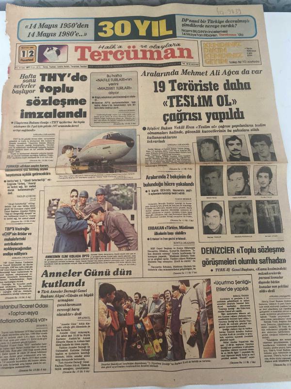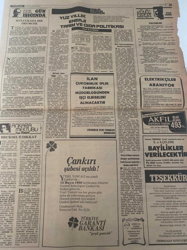 TERCÜMAN GAZETESİ - DOĞUM GÜNÜ HEDİYESİ (TURKISH NEWSPAPPER) - 12 MAYIS 1980 - SADECE TEK YAPRAKTIR -Mehmet Ali Ağca-Nazmi Bilgin-Aziz Ergin-Ahmet Kabaklı-Rauf Tamer-Yaşar Güngör-Kemal Önder-Sıtkı İnce-Hasan Kaplan-Aydın Telli-Beyti Temur-Mustafa Karakuş-Ahmet Uyar-Eren-Orhan-30 YIL-19 Teröriste daha TESLİM OL çağrısı yapıldı-Hafta sonu THYde toplu sözleşme imzalandı-Anneler Günü dün kutlandı-Denizciler Toplu sözleşme görüşmeleri olumlu safhada-Aralarında 2 bekçinin de bulunduğu hücre yakalandı-ERBAKAN Türkiyem Müslüman ülkelerin başı olabilirim-Yüz Yıllık Enerji Tarım ve Gıda Politikası-İlan Çukobirlik İplik Fabrikası Müdürlüğünden İşçi Elbiseleri Alınacaktır-Çankırı şubesi açıldı-Elektrikçiler aranıyor-Bayilikler verilecektir-Teşekkür-Perakendeciler AKFIL Jeans pantolon fiyatı 493 TL-Ankara Mektubu Brüksel’e Dikkat-Gün Işığında Kuluçkada Bir Örümcek-Sözün Kısası Kelimeler-Petrolden sonra değer patlaması beklenen sektör Gıda sektörü-Uçurtma Şenliği Etilerde yapıldı-İstanbul Ticaret Od, Kemal ılıcak tarafından kaleme alınmıştır. TERCÜMAN GAZETESİ - DOĞUM GÜNÜ HEDİYESİ (TURKISH NEWSPAPPER) - 12 MAYIS 1980 - SADECE TEK YAPRAKTIR -Mehmet Ali Ağca-Nazmi Bilgin-Aziz Ergin-Ahmet Kabaklı-Rauf Tamer-Yaşar Güngör-Kemal Önder-Sıtkı İnce-Hasan Kaplan-Aydın Telli-Beyti Temur-Mustafa Karakuş-Ahmet Uyar-Eren-Orhan-30 YIL-19 Teröriste daha TESLİM OL çağrısı yapıldı-Hafta sonu THYde toplu sözleşme imzalandı-Anneler Günü dün kutlandı-Denizciler Toplu sözleşme görüşmeleri olumlu safhada-Aralarında 2 bekçinin de bulunduğu hücre yakalandı-ERBAKAN Türkiyem Müslüman ülkelerin başı olabilirim-Yüz Yıllık Enerji Tarım ve Gıda Politikası-İlan Çukobirlik İplik Fabrikası Müdürlüğünden İşçi Elbiseleri Alınacaktır-Çankırı şubesi açıldı-Elektrikçiler aranıyor-Bayilikler verilecektir-Teşekkür-Perakendeciler AKFIL Jeans pantolon fiyatı 493 TL-Ankara Mektubu Brüksel’e Dikkat-Gün Işığında Kuluçkada Bir Örümcek-Sözün Kısası Kelimeler-Petrolden sonra değer patlaması beklenen sektör Gıda sektörü-Uçurtma Şenliği Etilerde yapıldı-İstanbul Ticaret Od adlı eser Türkçe dilindedir.