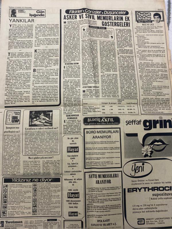 TERCÜMAN GAZETESİ - DOĞUM GÜNÜ HEDİYESİ (TURKISH NEWSPAPPER) - 13 KASIM 1975 - SADECE TEK YAPRAKTIR -Ahmet Kabaklı-Rauf Tamer-Suna SAN-Gürbüz Ersan-Kenan Eray-Elif Demirkul-Ali Ulaş-Meclis Başkanlığı için anlaşma sağlanamadı-Senato Başkanının seçilmemesi halinde Korutürkün Pakistana gidip gidemeyeceği tartışılıyor-Ocak ayı emekli çekleri bayramdan önce ödenecek-İntikam hırsı ile yanıyordum-7 Murat 250 öğrenciye Burs çekilişi için kuponlarınızı gönderiniz-Aralık ayı içinde otomobil alma sırası gelen iştirakçilerimiz-Karısını kandıran adamın 5 yaşındaki çocuğunu öldürdü-Büyükelçilerin katilleri mutlaka yakalanmalıdır-Münih Hanau ve Nürnbergdeki işçilerimiz yürüyüş yaptılar-Amerika BMin Siyonizm için aldığı kararı protesto etti-Öğretmen okullarında boykotlar genişliyor-5 suni böbrekli ayda 120 bin lirayla yaşıyor-Haftada 2 gün böbrek makinasının başına koşuyorlar-Gün Işığında Yankılar-Fikirler Görüşler Düşünceler-Asker ve sivil memurların ek göstergeleri-Sözün Kısası Nicedir-3 Sual 3 Ceva, Kemal ılıcak tarafından kaleme alınmıştır. TERCÜMAN GAZETESİ - DOĞUM GÜNÜ HEDİYESİ (TURKISH NEWSPAPPER) - 13 KASIM 1975 - SADECE TEK YAPRAKTIR -Ahmet Kabaklı-Rauf Tamer-Suna SAN-Gürbüz Ersan-Kenan Eray-Elif Demirkul-Ali Ulaş-Meclis Başkanlığı için anlaşma sağlanamadı-Senato Başkanının seçilmemesi halinde Korutürkün Pakistana gidip gidemeyeceği tartışılıyor-Ocak ayı emekli çekleri bayramdan önce ödenecek-İntikam hırsı ile yanıyordum-7 Murat 250 öğrenciye Burs çekilişi için kuponlarınızı gönderiniz-Aralık ayı içinde otomobil alma sırası gelen iştirakçilerimiz-Karısını kandıran adamın 5 yaşındaki çocuğunu öldürdü-Büyükelçilerin katilleri mutlaka yakalanmalıdır-Münih Hanau ve Nürnbergdeki işçilerimiz yürüyüş yaptılar-Amerika BMin Siyonizm için aldığı kararı protesto etti-Öğretmen okullarında boykotlar genişliyor-5 suni böbrekli ayda 120 bin lirayla yaşıyor-Haftada 2 gün böbrek makinasının başına koşuyorlar-Gün Işığında Yankılar-Fikirler Görüşler Düşünceler-Asker ve sivil memurların ek göstergeleri-Sözün Kısası Nicedir-3 Sual 3 Ceva adlı eser Türkçe dilindedir.