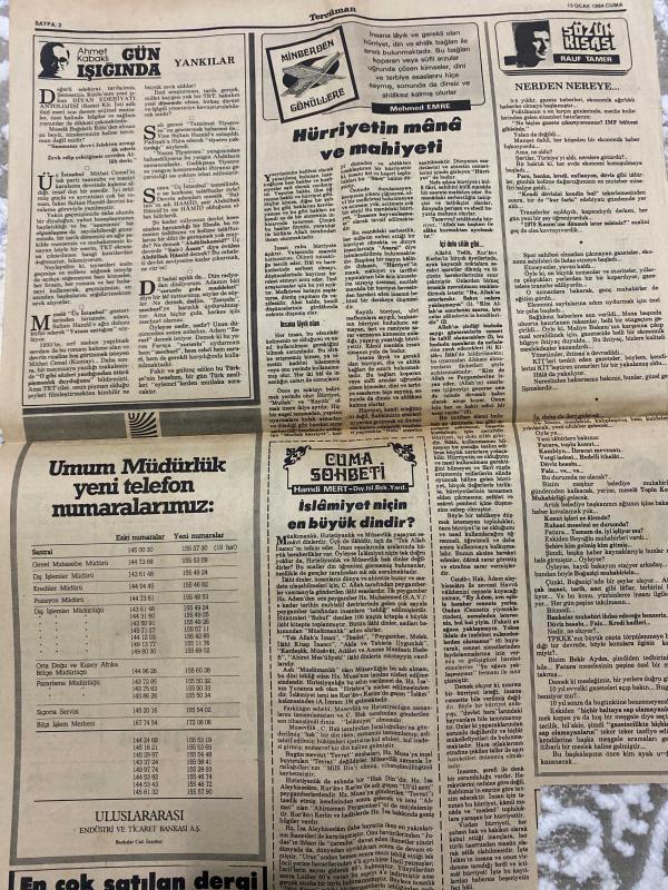 TERCÜMAN GAZETESİ - DOĞUM GÜNÜ HEDİYESİ (TURKISH NEWSPAPPER) - 13 OCAK 1984 - SADECE TEK YAPRAKTIR -Sarp Kuray-Selami Uncu-Nursun Erel-Turgut Özal-Fikret Helvacıoğlu-Hasan Zeki Ülger-Behçet Yolcu-Adem Uysal-Muharrem Özcan-Ahmet Kabaklı-Mehmed Emre-Rauf Tamer-Hamdi Mert-Seçim tarihi değişmeyecek-İç Politikada Son Durum-Sarp Kuray Ermeni örgütleriyle işbirliği yapıyor-AETye karşı elimizdeki kozu harcadık-Fatura sistemi vergi kaçağını önleyecek-Evren Özal kabul etti-Gözlükte Özal modası başladı-İslam Zirvesi hazırlık toplantısı başladı-ABD Dışişleri Bakanlığı Ermeni terörü sadece Türkleri değil bütün insanlığı tehdit ediyor-Muharremi ecel Almanyaya çağırdı-Hürriyetin mana ve mahiyeti-Nereden Nereye-Umum Müdürlük yeni telefon numaralarımız-Cuma Sohbeti İslamiyet niçin en büyük dindir-En çok satılan dergi, Kemal ılıcak tarafından kaleme alınmıştır. TERCÜMAN GAZETESİ - DOĞUM GÜNÜ HEDİYESİ (TURKISH NEWSPAPPER) - 13 OCAK 1984 - SADECE TEK YAPRAKTIR -Sarp Kuray-Selami Uncu-Nursun Erel-Turgut Özal-Fikret Helvacıoğlu-Hasan Zeki Ülger-Behçet Yolcu-Adem Uysal-Muharrem Özcan-Ahmet Kabaklı-Mehmed Emre-Rauf Tamer-Hamdi Mert-Seçim tarihi değişmeyecek-İç Politikada Son Durum-Sarp Kuray Ermeni örgütleriyle işbirliği yapıyor-AETye karşı elimizdeki kozu harcadık-Fatura sistemi vergi kaçağını önleyecek-Evren Özal kabul etti-Gözlükte Özal modası başladı-İslam Zirvesi hazırlık toplantısı başladı-ABD Dışişleri Bakanlığı Ermeni terörü sadece Türkleri değil bütün insanlığı tehdit ediyor-Muharremi ecel Almanyaya çağırdı-Hürriyetin mana ve mahiyeti-Nereden Nereye-Umum Müdürlük yeni telefon numaralarımız-Cuma Sohbeti İslamiyet niçin en büyük dindir-En çok satılan dergi adlı eser Türkçe dilindedir.