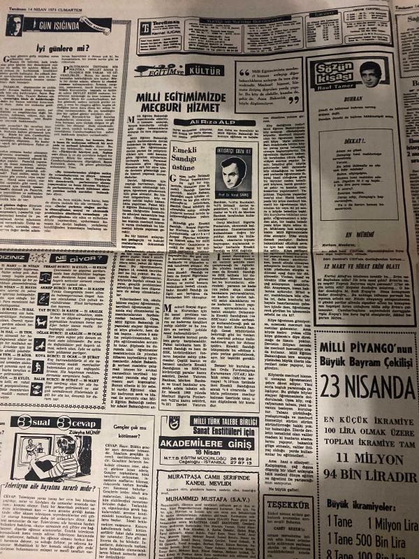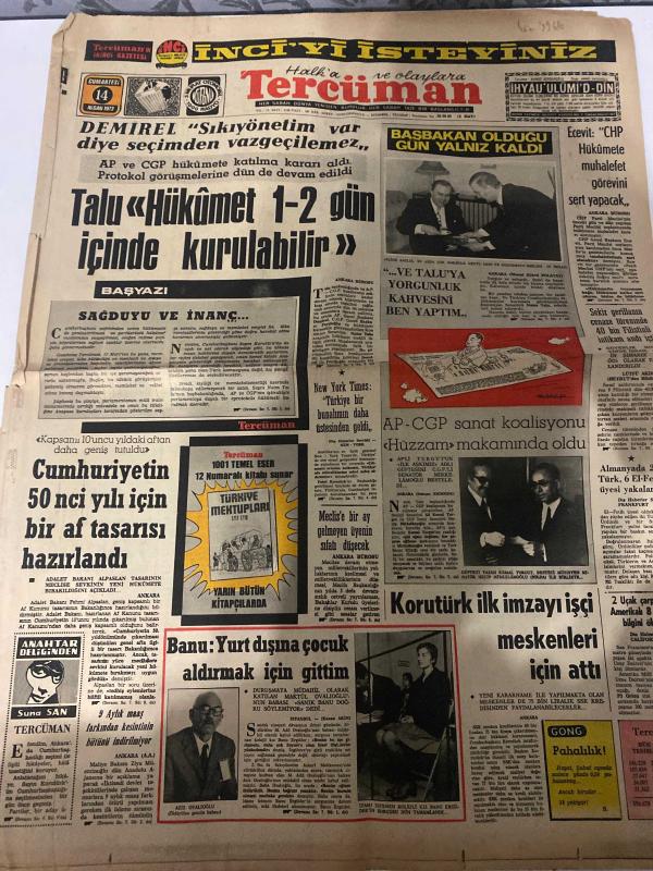 TERCÜMAN GAZETESİ - DOĞUM GÜNÜ HEDİYESİ (TURKISH NEWSPAPPER) - 14 NİSAN 1973 - SADECE DÖRT SAYFADIR -Süleyman Demirel-Bülent Ecevit-Suna San-Ali Rıza Alp-Rauf Tamer-Vural Savaş-Züleyha Münif-Aziz Ovalıoğlu-Kemal Turan-Refik Tagay-Sedat Taylan-Abdullah Malay-Fahri Şahimerden-Servet Şengün-Umut Taşkesen-Brian Birch-Talu Hükümet 1-2 gün içinde kurulabilir-Demirel Sıkıyönetim var diye seçimden vazgeçilemez-Cumhuriyetin 50 nci yılı için bir af tasarısı hazırlandı-AP CGP sanat koalisyonu Hüzzam makamında oldu-Korutürk ilk imzayı işçi meskenleri için attı-Banu Yurt dışına çocuk aldırmak için gittim-Milli eğitimimizde mecburi hizmet-Orhan Deniz’in ikinci bakanlığı-Sessiz istila-İyi günlere mi-Sözün kısası Buhran-En mühim-Milli piyango büyük bayram çekilişi 23 Nisanda-Bir Avrupa takımına karşı son yılların en farklı galibiyeti-En bilimsel ve yararlı antrenör Brian Birch-Beşiktaş Adana ile oynuyor-Milli takım İsviçre için 2 Mayısta kampa giriyor-Kayseride herşey şampiyonluk için-A Gücü PTT-Fener, Kemal ılıcak tarafından kaleme alınmıştır. TERCÜMAN GAZETESİ - DOĞUM GÜNÜ HEDİYESİ (TURKISH NEWSPAPPER) - 14 NİSAN 1973 - SADECE DÖRT SAYFADIR -Süleyman Demirel-Bülent Ecevit-Suna San-Ali Rıza Alp-Rauf Tamer-Vural Savaş-Züleyha Münif-Aziz Ovalıoğlu-Kemal Turan-Refik Tagay-Sedat Taylan-Abdullah Malay-Fahri Şahimerden-Servet Şengün-Umut Taşkesen-Brian Birch-Talu Hükümet 1-2 gün içinde kurulabilir-Demirel Sıkıyönetim var diye seçimden vazgeçilemez-Cumhuriyetin 50 nci yılı için bir af tasarısı hazırlandı-AP CGP sanat koalisyonu Hüzzam makamında oldu-Korutürk ilk imzayı işçi meskenleri için attı-Banu Yurt dışına çocuk aldırmak için gittim-Milli eğitimimizde mecburi hizmet-Orhan Deniz’in ikinci bakanlığı-Sessiz istila-İyi günlere mi-Sözün kısası Buhran-En mühim-Milli piyango büyük bayram çekilişi 23 Nisanda-Bir Avrupa takımına karşı son yılların en farklı galibiyeti-En bilimsel ve yararlı antrenör Brian Birch-Beşiktaş Adana ile oynuyor-Milli takım İsviçre için 2 Mayısta kampa giriyor-Kayseride herşey şampiyonluk için-A Gücü PTT-Fener adlı eser Türkçe dilindedir.