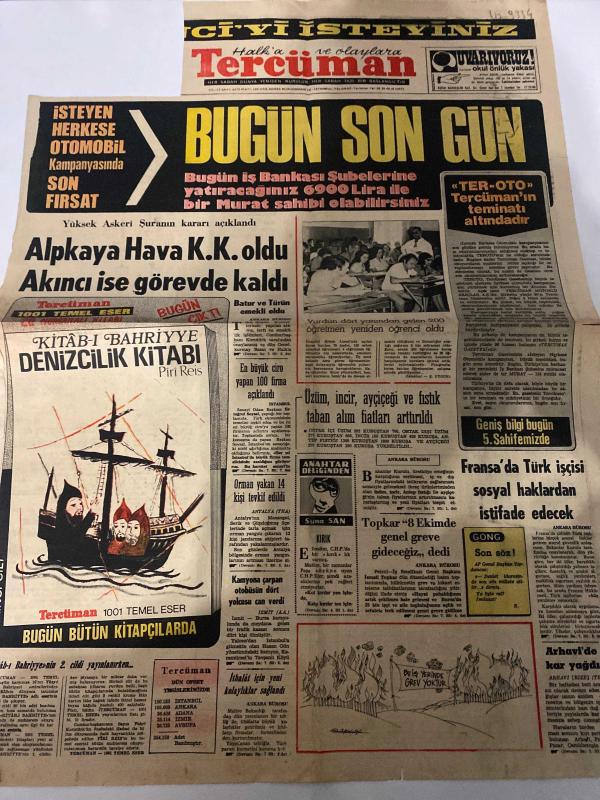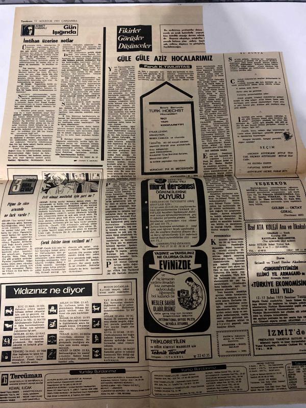 TERCÜMAN GAZETESİ - DOĞUM GÜNÜ HEDİYESİ (TURKISH NEWSPAPPER) - 15 AĞUSTOS 1973 - SADECE TEK YAPRAKTIR -Alpkaya-Akıncı-Piri Reis-Ahmet Kabaklı-Faruk K.Timurtaş-Aziz Hocalarımız-Bugün son gün-Alpkaya Hava K.K.oldu Akıncı ise görevde kaldı-Kitab-ı Bahriye Denizcilik Kitabı-Fransa’da Türk işçisi sosyal haklardan istifade edecek-Üzüm incir ayçiçeği ve fıstık taban alım iddialı arttırıldı-Topkar 8 Ekimde genel greve gideceğiz dedi-İmtihan üzerine notlar-Güle güle aziz hocalarımız-Yıldızınız ne diyor-Evlenmek mutlu için şart mı-Çocuk felcine önlem verilmeli mi-Yaşınız ve tahsiliniz ne olursa olsun evinizde meslek sahibi olabilirsiniz-Sıra beklemeden komple servis-Üniversiteye bu kitaplarla girilir-İdrarda şeker tayini testi adlı eser Türkçe dilindedir.