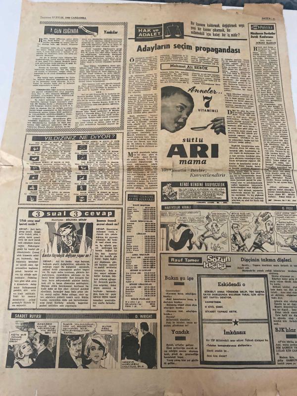 TERCÜMAN GAZETESİ - DOĞUM GÜNÜ HEDİYESİ (TURKISH NEWSPAPPER) - 17 EYLÜL 1969 - SADECE TEK YAPRAKTIR -Sadi Toker-Tarık Kutay-Ali Hürilmaz-Lütfü Akdoğan-Ali Rıza Alp-Şemsi Sılkım-Refik Sönmezsoy-Suna SAN-Nermin Çorban-Hülya Mavili-Mehmet Ali Sebük-Mehmet Ali Sebük-Şükrü Baban-Züleyha Münir-Rauf Tamer-O Filiz-D Wright-Bir yolcu uçağımız Sofyaya kaçırıldı-Sadi Toker adındaki akli muvazenesi bozuk bir hukuk öğrencisinin tabanca tehdidi altında-İmamı Azam Ebu Hanife-Sultanların Mezhebi Mezheplerin Sultanı-Ebu Hanifenin Türbesi-Yolcular Çok heyecanlı bir macera yaşadık dediler-Uçakta Bulgaristandan kaçan milli bisikletçi Ali Hürilmaz da vardı-Cuma günü başlıyoruz-Lise-Adayların seçim propagandası-Hak ve Adalet-Bir kanun kaldırmak değiştirmek veya yeni bir kanun çıkarmak bir milletvekili için kolay bir iş midir-Dış Politika-Musliman Devletler-Kendi kendine radyoculuk-Yıldızınız Ne Diyor-3 sual 3 cevap-Saadet Rüyası-Hafiyeler Kralı-Sözün kısası Bakın şu işe-İmkansız-Eski den o-Dişçinin takma di adlı eser, Kitap > Süreli Yayınlar > Gazeteler > Türkiye > Genel > Günlük kategorisinde İkinci El olarak satıştadır.