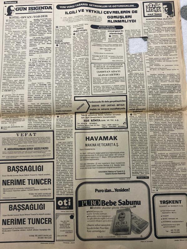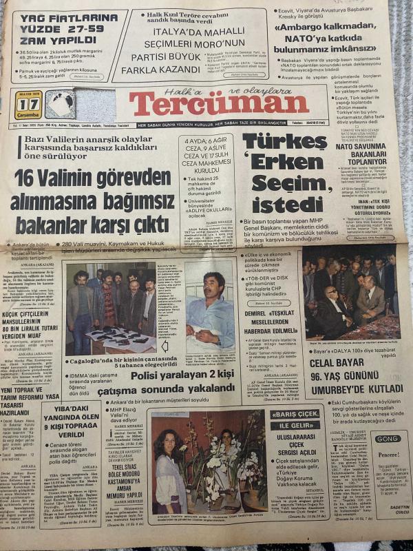 TERCÜMAN GAZETESİ - DOĞUM GÜNÜ HEDİYESİ (TURKISH NEWSPAPPER) - 17 MAYIS 1978 - SADECE TEK YAPRAKTIR -Ahmet Kabaklı-Rauf Tamer-Celal Bayar-Bülent Ecevit-Kreisky-Necdet Uğur-Sadettin Çulcu-Nerime Tuncer-H Abdurrahman Şeref Güzel Yazıcı-16 Valinin görevden alınmasına bağımsız bakanlar karşı çıktı-Bazı Valilerin anarşik olaylar karşısında başarısız kaldıkları öne sürülüyor-Türkeş Erken Seçim istedi-4 ayda 6 ağır ceza 9 asliye ceza ve 17 sulh ceza mahkemesi kuruldu-Küçük çiftçilerin mahsullerinin 80 bin liralık tutarı vergiden muaf-Yeni toprak ve tarım reformu yasa tasarısı hazırlandı-Yiba’daki yangında ölen 9 kişi toprağa verildi-Polisi yaralayan 2 kişi çatışma sonunda yakalandı-Cağaloğlu’nda bir kişinin çantasında 5 tabanca ele geçirildi-İtalya’da mahalli seçimleri Moro’nun partisi büyük farkla kazandı-Ambargo kalkmadan NATO’ya katkıda bulunmamız imkansız-NATO Savunma Bakanları toplanıyor-Demirel teşkilat meselelerinden haberdar edilmeli-Celal Bayar 96 yaş gününü Umurbey’de kutladı-Barış, Kemal ılıcak tarafından kaleme alınmıştır. TERCÜMAN GAZETESİ - DOĞUM GÜNÜ HEDİYESİ (TURKISH NEWSPAPPER) - 17 MAYIS 1978 - SADECE TEK YAPRAKTIR -Ahmet Kabaklı-Rauf Tamer-Celal Bayar-Bülent Ecevit-Kreisky-Necdet Uğur-Sadettin Çulcu-Nerime Tuncer-H Abdurrahman Şeref Güzel Yazıcı-16 Valinin görevden alınmasına bağımsız bakanlar karşı çıktı-Bazı Valilerin anarşik olaylar karşısında başarısız kaldıkları öne sürülüyor-Türkeş Erken Seçim istedi-4 ayda 6 ağır ceza 9 asliye ceza ve 17 sulh ceza mahkemesi kuruldu-Küçük çiftçilerin mahsullerinin 80 bin liralık tutarı vergiden muaf-Yeni toprak ve tarım reformu yasa tasarısı hazırlandı-Yiba’daki yangında ölen 9 kişi toprağa verildi-Polisi yaralayan 2 kişi çatışma sonunda yakalandı-Cağaloğlu’nda bir kişinin çantasında 5 tabanca ele geçirildi-İtalya’da mahalli seçimleri Moro’nun partisi büyük farkla kazandı-Ambargo kalkmadan NATO’ya katkıda bulunmamız imkansız-NATO Savunma Bakanları toplanıyor-Demirel teşkilat meselelerinden haberdar edilmeli-Celal Bayar 96 yaş gününü Umurbey’de kutladı-Barış adlı eser Türkçe dilindedir.