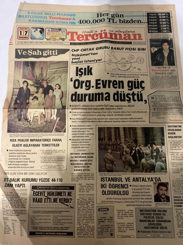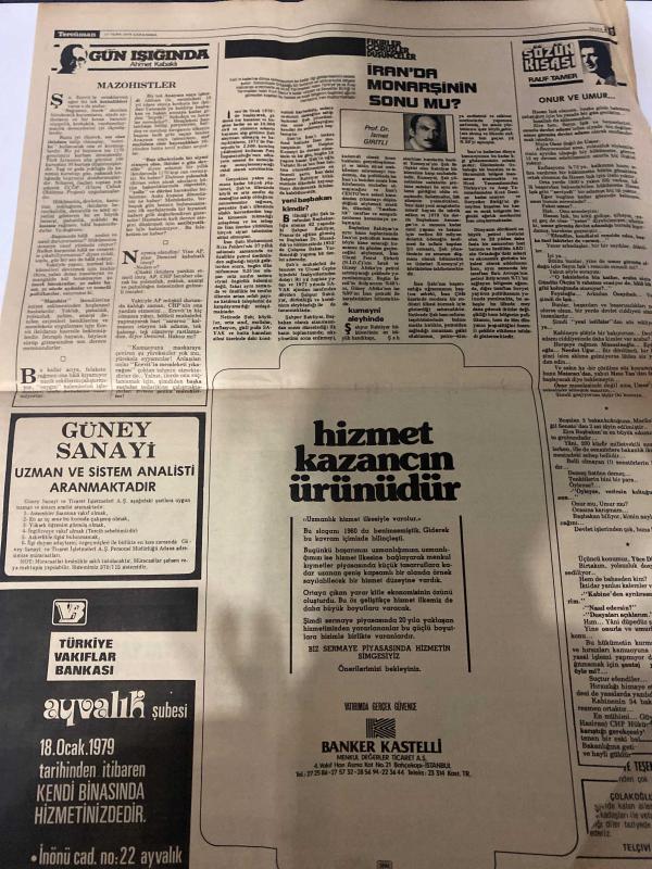 TERCÜMAN GAZETESİ - DOĞUM GÜNÜ HEDİYESİ (TURKISH NEWSPAPPER) - 17 OCAK 1979 - SADECE TEK YAPRAKTIR -Süleyman Demirel-Rıza Pehlevi-Farah-Turgut Acar-Ahmet Kabaklı-Rauf Tamer-İsmet Giritli-Ve Şah gitti-Işık Org Evren güç duruma düştü-Rıza Pehlevi İmparatoriçe Farah ülkeyi ağlayarak terk ettiler-Et Balık Kurumu yüzde 44 110 zam yaptı-Ecevit hükümeti ne vaad etti ne verdi-İstanbul ve Antalya’da iki öğrenci öldürüldü-İran’da monarşinin sonu mu-Güvenlik kuvvetleri Göztepe SSK Hastanesini aradılar-Bir otobüs 50 yolcusu ile birlikte sel sularına kapıldı-Bu hükümet enkazdır-Sıkıyönetim davalarına bugün başlanıyor-Tarihin kara günleri-Onur ve umut-Güney Sanayi uzman ve sistem analisti aranmaktadır-Türkiye Vakıflar Bankası Ayvalık şubesi-Banker Kastelli hizmet kazancın ürünüdür-Gün Işığında-Sözün Kısası Fikir Bahçesi adlı eser Türkçe dilindedir.