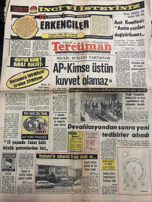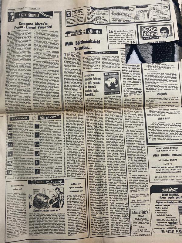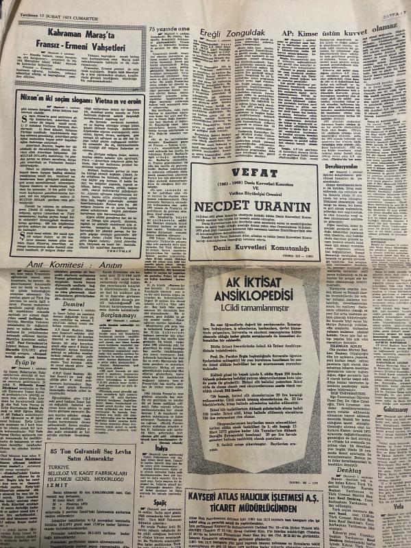 TERCÜMAN GAZETESİ - DOĞUM GÜNÜ HEDİYESİ (TURKISH NEWSPAPPER) - 17 ŞUBAT 1973 - SADECE DÖRT SAYFADIR -Kenan Akın-Suna San-Beşir Atalay-Kemal Ilıcak-Rauf Tamer-Ali Rıza Alp-Şükrü Baban-Necdet Uran-Halit Kıvanç-İslam Çupi-Öcal Uluc-Salih Binay-Rıdvan Uysal-O Şeref Fenerbahçe için Ziya Pele’den bile büyüktür-Temeli Beyazıt attı binayı Pekin yapacak G Saray-Milli takım için ümitli-Yabancı antrenör ihtiyacı bitecek-Feriköy Sivas-Lig dev bir maçla açılıyor-Beşiktaş Göztepe A Gücü Şeker-Lig tahmin krallığı-Haftanın maçları kaç kaç bitecek-İki çetin maç var-Bursa kongreye tek liste getiriyor-Polat’a göre bilimsel yoldan geçecek Türk çalıştırıcılar bütün takımlara hakim olacak-Kolej voleybolcular Çeşme elemek için hazırlanıyor-Spaijc İtalya’yı yenebilirsiniz-Kahraman Maraş’ta Fransız Ermeni vahşetleri-Milli eğitimimizdeki tezatlar-Bilgi ve değişmez ahlak kuralları-Avrupa’nın Amerika hükümeti ve halkı yanında en hararetli avukatı İngiliz başvekili-Anıt komitesi anıtın yazıları değiştirilemez-AP k, Kemal ılıcak tarafından kaleme alınmıştır. TERCÜMAN GAZETESİ - DOĞUM GÜNÜ HEDİYESİ (TURKISH NEWSPAPPER) - 17 ŞUBAT 1973 - SADECE DÖRT SAYFADIR -Kenan Akın-Suna San-Beşir Atalay-Kemal Ilıcak-Rauf Tamer-Ali Rıza Alp-Şükrü Baban-Necdet Uran-Halit Kıvanç-İslam Çupi-Öcal Uluc-Salih Binay-Rıdvan Uysal-O Şeref Fenerbahçe için Ziya Pele’den bile büyüktür-Temeli Beyazıt attı binayı Pekin yapacak G Saray-Milli takım için ümitli-Yabancı antrenör ihtiyacı bitecek-Feriköy Sivas-Lig dev bir maçla açılıyor-Beşiktaş Göztepe A Gücü Şeker-Lig tahmin krallığı-Haftanın maçları kaç kaç bitecek-İki çetin maç var-Bursa kongreye tek liste getiriyor-Polat’a göre bilimsel yoldan geçecek Türk çalıştırıcılar bütün takımlara hakim olacak-Kolej voleybolcular Çeşme elemek için hazırlanıyor-Spaijc İtalya’yı yenebilirsiniz-Kahraman Maraş’ta Fransız Ermeni vahşetleri-Milli eğitimimizdeki tezatlar-Bilgi ve değişmez ahlak kuralları-Avrupa’nın Amerika hükümeti ve halkı yanında en hararetli avukatı İngiliz başvekili-Anıt komitesi anıtın yazıları değiştirilemez-AP k adlı eser Türkçe dilindedir.
