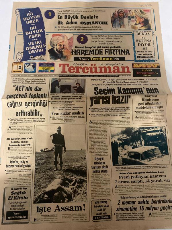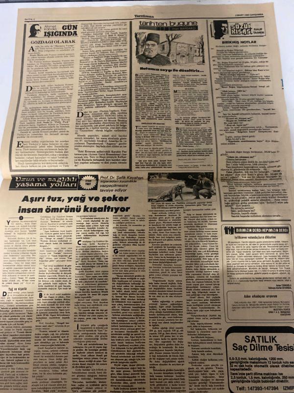 TERCÜMAN GAZETESİ - DOĞUM GÜNÜ HEDİYESİ (TURKISH NEWSPAPPER) - 2 MART 1983 - SADECE TEK YAPRAKTIR -Tarık Buğra-Yılmaz Öztuna-Safiye Sultan-Kösem Sultan-Turhan Sultan-Ferand Rouillon-Mevlüt Işık-Ahmet Şenova-Ahmet Kabaklı-İlhan Bardakçı-Rauf Tamer-Prof Dr Şefik Kayahan-En Büyük Devlete İlk Adım Osmancık-Haremde Fırtına-AETnin dar çerçeveli toplantı çağrısı gerginliği arttırabilir-Seçim Kanununun yarısı hazır-Anayasa Komisyonu geri gönderilen maddeleri görüştü-Fransızlar şaşkın-İşte Assam-Ankaranın göbeğinde zincirleme kaza Freni patlayan kamyon 7 araca çarptı 14 yaralı var-2 memur sahte bordrolarla zimmetine 15 milyon geçirdi-Gözdağı alarak-Denizcilik ve Deniz Ticareti-Hatamızı saygı ile düzeltiriz-Birikmiş Notlar-Aşırı tuz yağ ve şeker insan ömrünü kısaltıyor-Uzun ve sağlıklı yaşama yolları-Asker arkadaşını arıyor-Satılık Saç Dilme Tesisi adlı eser Türkçe dilindedir.