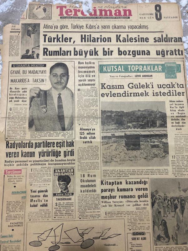 TERCÜMAN GAZETESİ - DOĞUM GÜNÜ HEDİYESİ (TURKISH NEWSPAPPER) - 2 MAYIS 1964 - SADECE TEK YAPRAKTIR -LÜTFÜ AKDOĞAN-Kasım Gülek-William Saroyan-Sezen CUMHUR-Ahmet KABAKLI-Mazhar KUNT-Murat SERTOĞLU-M.N.S.-Atina’ya göre Türkiye Kıbrıs’a yarın çıkarma yapacakmış-Türkler Hilarion Kalesine saldıran Rumları büyük bir bozguna uğrattı-Gyani bu madalyayı Makarios’a taksın-Radyolarda partilere eşit hak veren kanun yürürlüğe girdi-Kutsal Topraklar-Kasım Gülek’i uçakta evlendirmek istediler-Almanya’ya 125 milyon liralık silah sattık-18 Rum okulunun muadeli kaldırıldı-Kitaptan kazandığı parayı kumara veren meşhur romancı geldi-Montaj Sanayii Talimatı büyük boşluk dolduruyor-İktisat Dünyası Planlama uzmanları ile toplantı yapılıyor-Suni gübre kredisi 300 milyon çıkarıldı-Günün Olayları-Gümrük Vergisi-Macaristan ticari anlaşma-Altın Fiyatları-3 Sual 3 Cevap-Atatürk’ün Fedaisi Topal Osman-Türkler Derneğinin Konferansı-Haydarpaşa Lisesinin-Saadet Rüyası-Silah Kanunu-Teodora-Bizans’ın aşk ilahesi imparat, Kemal ılıcak tarafından kaleme alınmıştır. TERCÜMAN GAZETESİ - DOĞUM GÜNÜ HEDİYESİ (TURKISH NEWSPAPPER) - 2 MAYIS 1964 - SADECE TEK YAPRAKTIR -LÜTFÜ AKDOĞAN-Kasım Gülek-William Saroyan-Sezen CUMHUR-Ahmet KABAKLI-Mazhar KUNT-Murat SERTOĞLU-M.N.S.-Atina’ya göre Türkiye Kıbrıs’a yarın çıkarma yapacakmış-Türkler Hilarion Kalesine saldıran Rumları büyük bir bozguna uğrattı-Gyani bu madalyayı Makarios’a taksın-Radyolarda partilere eşit hak veren kanun yürürlüğe girdi-Kutsal Topraklar-Kasım Gülek’i uçakta evlendirmek istediler-Almanya’ya 125 milyon liralık silah sattık-18 Rum okulunun muadeli kaldırıldı-Kitaptan kazandığı parayı kumara veren meşhur romancı geldi-Montaj Sanayii Talimatı büyük boşluk dolduruyor-İktisat Dünyası Planlama uzmanları ile toplantı yapılıyor-Suni gübre kredisi 300 milyon çıkarıldı-Günün Olayları-Gümrük Vergisi-Macaristan ticari anlaşma-Altın Fiyatları-3 Sual 3 Cevap-Atatürk’ün Fedaisi Topal Osman-Türkler Derneğinin Konferansı-Haydarpaşa Lisesinin-Saadet Rüyası-Silah Kanunu-Teodora-Bizans’ın aşk ilahesi imparat adlı eser Türkçe dilindedir.