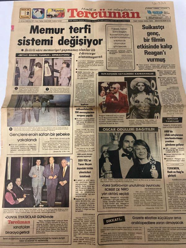 TERCÜMAN GAZETESİ - DOĞUM GÜNÜ HEDİYESİ (TURKISH NEWSPAPPER) - 2 NİSAN 1981 - SADECE TEK YAPRAKTIR -Ronald Reagan-Jodie Foster-Robert De Niro-Taner Akçam-Ahmet Kabaklı-Mahmut Baler-Rauf Tamer-İsmail Efe-Celal Bayar-Atıf Yılmaz-Fikri Atay-E Kurmay Albay Sadi Sarptır-Memur terfi sistemi değişiyor-Suikastçı genç bir filmin etkisinde kalıp Reagani vurmuş-Gençlere eroin satan bir şebeke yakalandı-Oscar ödülleri dağıtıldı-Taksi Şoförünün unutulmaz oyuncusu Robert De Niro yılın aktörü seçildi-Dünya tiyatroları gününde Tercüman sanatçıları biraraya getirdi-İsmail Efe Ödemişli Atıfın-Yaşayan Türkçemiz Rumeline sıçrayan dil anarşisi-Anarşi hangi partilerle bulaştı-Öküze boynuzu ağır gelir mi-Sözün Kısası Bazı Notlar-Yeni çıktı 2 temel eser daha-Vefat Cemile Bodur-Dikkat Gazete ebatları küçülüyor ama ansiklopedilere zararı olmayacak-Türkmen Bush ve Hague ile görüştü-ABDde silah satışlarının sınırlandırılması yeniden gündeme geliyor-Dev Yolun Taner Akçam dışındaki bütün yöneticileri tutuklandı adlı eser Türkçe dilindedir.