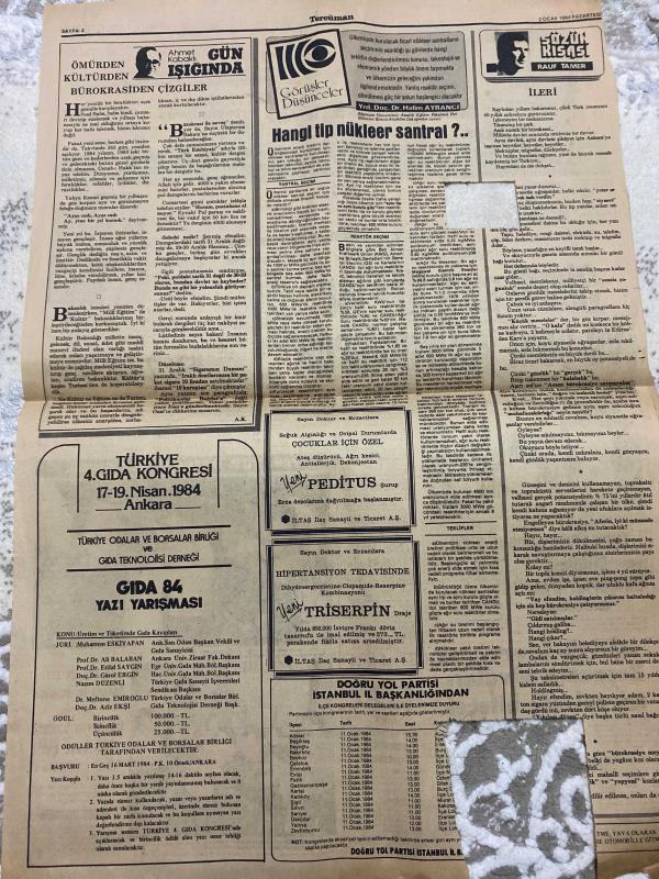 TERCÜMAN GAZETESİ - DOĞUM GÜNÜ HEDİYESİ (TURKISH NEWSPAPPER) - 2 OCAK 1984 - SADECE TEK YAPRAKTIR -Turgut Özal-Kaya Erdem-Ahmet Kabaklı-Rauf Tamer-Halim Ayrancı-Ahmet İsmailov Osmanov-Gülsüm Osmanov-Necat Eldem-Muharrem Eskiyapan-Ali Balaban-Erdal Saygın-Gürsel Ergin-Nazım Düzenli-Mefhume Emiroğlu-Aziz Ekşi-Şimdi sıra KİTler ve yeni yatırımlarda-Özal hükümeti 15 günde 15 büyük adım attı-Kavas casus çıktı-Türk asıllı görevli gizli bilgileri Bulgarlara sattı-Boşanma davaları tek celsede bitecek-Diploması iptal edilen bazı öğretmenler mesleğe dönebilecek-Yeni yıla huzur içinde girdik-Yılbaşı gecesi Ankara feribotunda 80 bin televizyon başında 1000 liraya geldi-Ahmet Kabaklı edebi röportajda Yılın Yazarı seçildi-Gün Işığında-Ömürden Kültürden Bürokrasiden Çizgiler-Görüşler Düşünceler-Hangi tip nükleer santral-Sözün Kısası-İleri-Türkiye 4 Gıda Kongresi-Gıda 84 Yazı Yarışması-Doğru Yol Partisi İstanbul İl Başkanlığından, Kemal ılıcak tarafından kaleme alınmıştır. TERCÜMAN GAZETESİ - DOĞUM GÜNÜ HEDİYESİ (TURKISH NEWSPAPPER) - 2 OCAK 1984 - SADECE TEK YAPRAKTIR -Turgut Özal-Kaya Erdem-Ahmet Kabaklı-Rauf Tamer-Halim Ayrancı-Ahmet İsmailov Osmanov-Gülsüm Osmanov-Necat Eldem-Muharrem Eskiyapan-Ali Balaban-Erdal Saygın-Gürsel Ergin-Nazım Düzenli-Mefhume Emiroğlu-Aziz Ekşi-Şimdi sıra KİTler ve yeni yatırımlarda-Özal hükümeti 15 günde 15 büyük adım attı-Kavas casus çıktı-Türk asıllı görevli gizli bilgileri Bulgarlara sattı-Boşanma davaları tek celsede bitecek-Diploması iptal edilen bazı öğretmenler mesleğe dönebilecek-Yeni yıla huzur içinde girdik-Yılbaşı gecesi Ankara feribotunda 80 bin televizyon başında 1000 liraya geldi-Ahmet Kabaklı edebi röportajda Yılın Yazarı seçildi-Gün Işığında-Ömürden Kültürden Bürokrasiden Çizgiler-Görüşler Düşünceler-Hangi tip nükleer santral-Sözün Kısası-İleri-Türkiye 4 Gıda Kongresi-Gıda 84 Yazı Yarışması-Doğru Yol Partisi İstanbul İl Başkanlığından adlı eser Türkçe dilindedir.