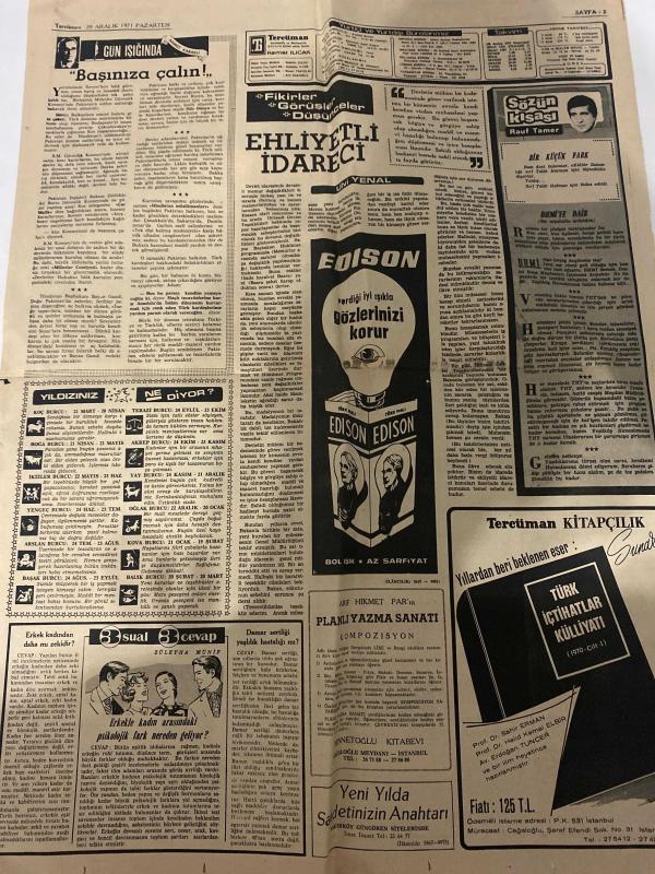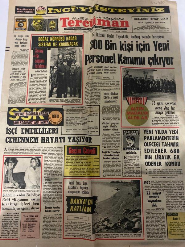 TERCÜMAN GAZETESİ - DOĞUM GÜNÜ HEDİYESİ (TURKISH NEWSPAPPER) - 20 ARALIK 1971 - SADECE TEK YAPRAKTIR -Cevdet Sunay-Refik Somnezos-Nurul Emin-Suna San-Murat Taşkın-Rauf Tamer-Kemal Ilıcak-Uğur Yücel-Züleyha Münif-Arif Hikmet Par-Şakir Erman-Halit Kemal Elbir-Erdoğan Tuncer-300 Bin kişi için Yeni personel Kanunu çıkıyor-İşçi emeklileri cehennem hayatı yaşıyor-Boğaz köprüsü radar sistemi ile korunacak-Berat ve Altın Madalya aldılar-Yeni yılda yedi parlamenterin öleceği tahmin edilerek 688 bin liralık ek ödenek kondu-22 maliyet memuru kaymakam oldu-Dakkada katliam-Geçim Cetveli-Sıhhi’nin kadın Belediye Reisi Kocamın yarım bıraktığı işleri ben tamamlayacağım diyor-Başınıza çalın-Ehliyetli idareci-Planlı yazma sanatı-Tercüman Kitapçılık-Yeni Yılda Saatinizin Anahtarı-Erkekle kadın arasındaki psikoloji fark nereden geliyor-3 sual 3 cevap-Yıldızınız ne diyor-Fikirler görüşler düşünceler-Sözün kısası-Gün ışığında-Anahatar deliğinden-Gong Bizde-Beklenen kitap çıktı İslam açısından sosyalizm-İnci adlı eser Türkçe dilindedir.