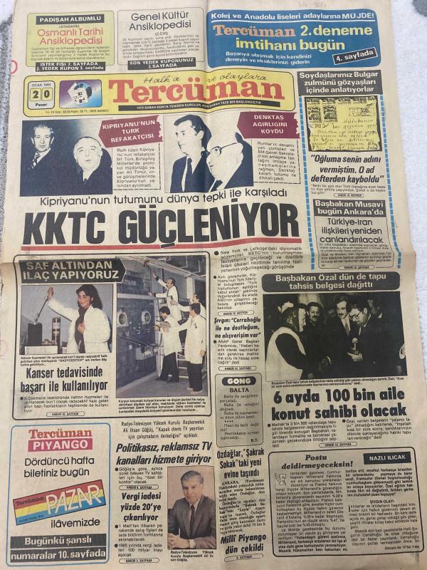 TERCÜMAN GAZETESİ - DOĞUM GÜNÜ HEDİYESİ (TURKISH NEWSPAPPER) - 20 OCAK 1985 - SADECE TEK YAPRAKTIR -Turgut Özal-Kipriyanu-Denktaş-Musavi-Ali İhsan Göğüş-Nazlı Ilıcak-Ahmet Kabaklı-Yahya Kemal-Reha Oğuz Türkkan-Rauf Tamer-Sıvgın-KKTC güçleniyor-Kipriyanu nun tutumunu dünya tepki ile karşıladı-Kıbrıyanun Türk refakatçisi-Denktaş ağırlığını koydu-Saf altından ilaç yapıyoruz-Kanser tedavisinde başarı ile kullanılıyor-Başbakan Musavi bugün Ankara da-Türkiye İran ilişkilerinden canlandırılacak-Başbakan Özal dün de tapu tahsis belgesi dağıttı-6 ayda 100 bin aile konut sahibi olacak-Politikasız reklamsız TV kanalları hizmete giriyor-Vergi iadesi yüzde 20 ye çıkarılıyor-Özdağlar Şakrak Sokak taki yeni evine taşındı-Milli Piyango dün çekildi-Oğluma senin adını vermiştim O ad defterden kayboldu-Duvar ekranı ve bilek TV lerine doğru-İyisi kötüsüyle televizyonun geleceği-Yılın ideal çifti-Vestel Ferguson Mucize değil gerçek-Devlet Hava Meydanları İşletmesi Genel Müdürlüğü-Tercüman Piyango Dördüncü adlı eser, Kitap > Süreli Yayınlar > Gazeteler > Türkiye > Genel > Günlük kategorisinde İkinci El olarak satıştadır.