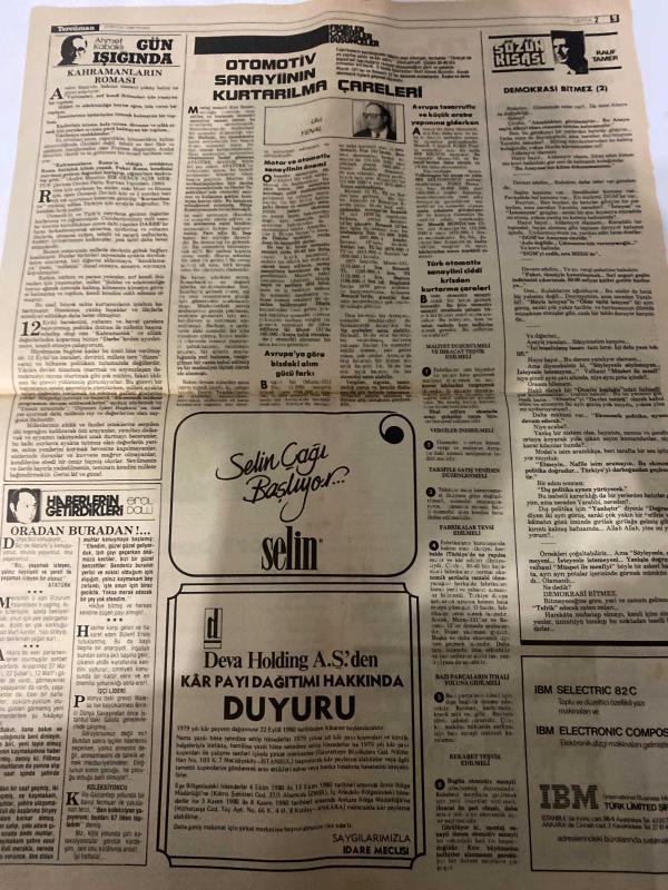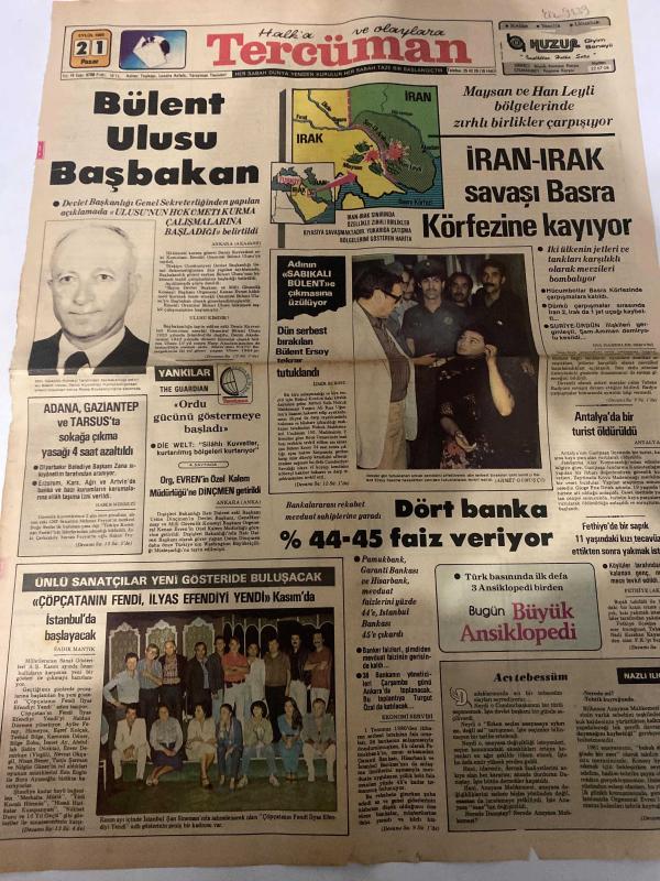 TERCÜMAN GAZETESİ - DOĞUM GÜNÜ HEDİYESİ (TURKISH NEWSPAPPER) - 21 EYLÜL 1980 - SADECE TEK YAPRAKTIR -Bülent Ulusu-Bülent Ersoy-Turgut Özal-Zana-Sadık Mantık-Nuhbet Duru-Tevhid Bilge-Kamuran Usluer-Nalan Güney-Ahmet Kabaklı-Rauf Tamer-Uni Yenal-Bülent Ulusu Başbakan-İran Irak savaşı Basra Körfezine kayıyor-Maysan ve Han Leyli bölgelerinde zırhlı birlikler çarpışıyor-İstanbul’a nihayet kurt da indi-Adının sabıkalı Bülent’e çıkmasına üzülüyor-Dün serbest bırakılan Bülent Ersoy tekrar tutuklandı-Dört banka yüzde 44 45 faiz veriyor-Adana Gaziantep ve Tarsus’ta sokağa çıkma yasağı 4 saat azaltıldı-Ünlü sanatçılar yeni gösteride buluşacak Çöpçatanın Fendi İlyas Efendiyi Yendi Kasım’da İstanbul’da başlayacak-Otomotiv sanayinin kurtarılma çareleri-Demokrasi bitmez-Acte tebessüm-Deva Holding A S den kar payı dağıtımı hakkında duyuru-IBM Selectric 82 C-IBM Electronic Composer adlı eser Türkçe dilindedir.