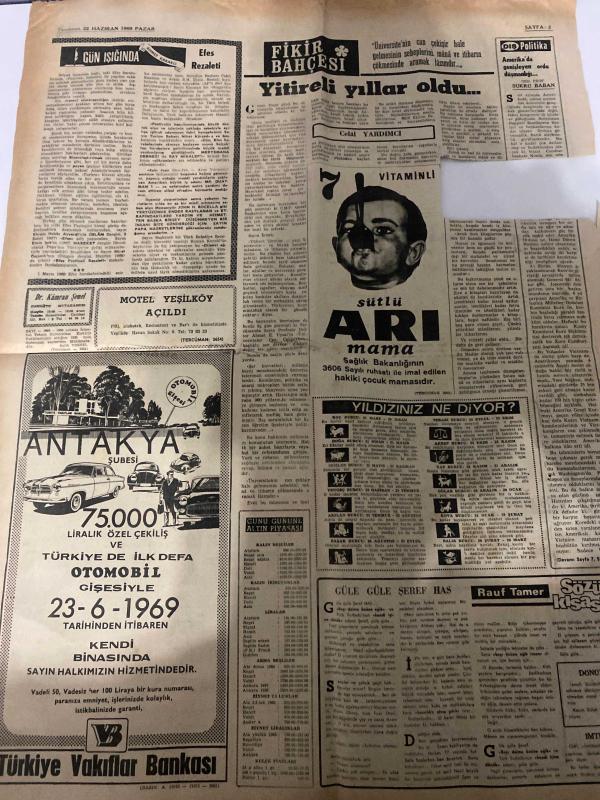 TERCÜMAN GAZETESİ - DOĞUM GÜNÜ HEDİYESİ (TURKISH NEWSPAPPER) - 22 HAZİRAN 1969 - SADECE TEK YAPRAKTIR -Şaki Özbay-Feyzioğlu-İbrahim-Mutlu-Erol Perşan-Bayram Yılmaz-Ömer Özkan-Celal Yardımcı-Rauf Tamer-Şaki Özbay Delik deşik edilerek öldürüldü-Teşekkür ederim Allah Tercüman’dan razı olsun-Erzurum’da komünizmi telin mitingi yapılacak-Bekar kadınlar erkeklerden çok-İşçi mitinginde TİP’li 5 öğrenci tutuklandı-Hamal İbrahim Tercüman’ın şahane katına sahip oldu-Günde 800 1000 kilo yükü sırtında taşıyıp haftada ancak 100 lira kazanan İbrahim artık rahata kavuştu-Bu da Paytoncu üniforması-Toplum polisinin garip silahlar müzesi-Yaralı öğrenciler ifade vermedi-Danıştay kararı Senato’ya gönderildi-Gelin yüzünden 2 aile çarpıştı 2 ölü 4 yaralı var-2 gencin kavgası sonunda jandarma karakolunun altı üstüne getirildi-İlk insanın Ay’ı Dünya’dan seyredişi-Gün ışığında-Efes Rezaleti-Fikir Bahçesi-Yitirilen yıllar oldu-7 vitaminli sütlü Arı mama-Yıldızınız ne diyor-Motel Yeşilköy açıldı-Antakya şubesi 75 adlı eser Türkçe dilindedir.