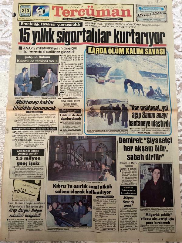 TERCÜMAN GAZETESİ - DOĞUM GÜNÜ HEDİYESİ (TURKISH NEWSPAPPER) - 23 ARALIK 1985 - SADECE TEK YAPRAKTIR-Turgut Özal-Mustafa Kalemli-Doğan Sümel-Rafet Hüner-Yavuz Donat-Fikret Dadaş-Ahmet Yabuloğlu-Ahmet Kabaklı-Rauf Tamer-Abdülhamid-Mehmet Yurdakul-Abdullah Devriş-15 yıllık sigortalılar kurtarıyor-Karda ölüm kalım savaşı-Kar makinesi yol açıp Saime anayı hastaneye ulaştırdı-Mülktep haklar titizlikle korunacak-Girişim derhal durdurulmalı-Geleceğin ümidi ümitsiz gençlik 2.5 milyon genç işsiz-Kıbrısta asırlık cami nikah salonu olarak kullanılıyor-Arap dergisi Bulgar zulmünü belgeledi-Demirel siyasetçi her akşam ölür sabah dirilir-Milyarlık çekiliş yılbaşı alışverişi için para bırakmadı-Halaskâr Zabitan olayı ve beyannamesi-Öküz açlığı-Bir kâbus gibi-Okuyucuların forumu-Demokrasiden ne anlıyoruz-Demokrasi fazilettir fakat-Kimin için-Birimizin derdi hepimizin derdi-Sağlık ve Sosyal Yardım Bakanlığına-Teşekkür-Tercüman Çocuk Dergisi adlı eser Türkçe dilindedir.