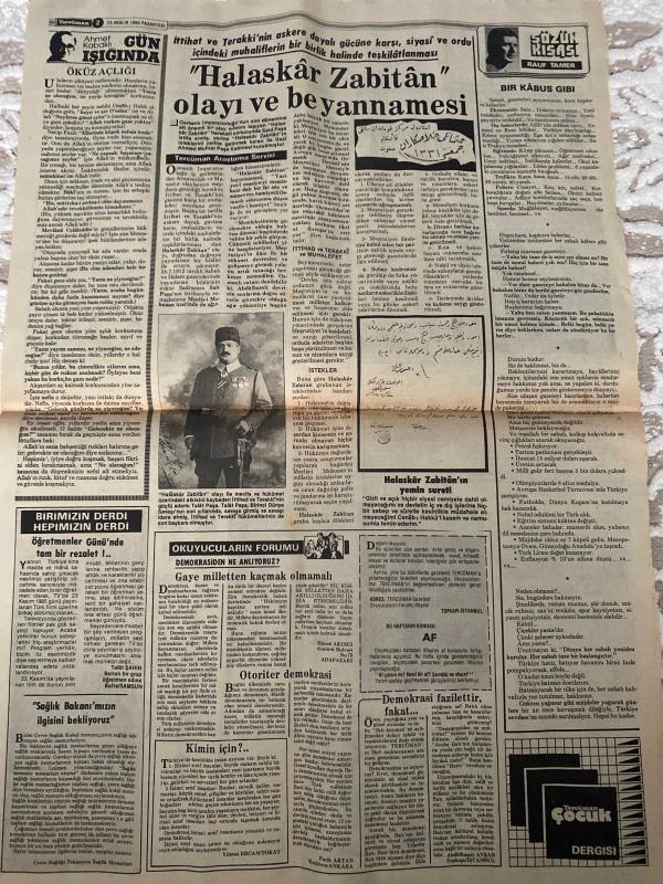 TERCÜMAN GAZETESİ - DOĞUM GÜNÜ HEDİYESİ (TURKISH NEWSPAPPER) - 23 ARALIK 1985 - SADECE TEK YAPRAKTIR-Turgut Özal-Mustafa Kalemli-Doğan Sümel-Rafet Hüner-Yavuz Donat-Fikret Dadaş-Ahmet Yabuloğlu-Ahmet Kabaklı-Rauf Tamer-Abdülhamid-Mehmet Yurdakul-Abdullah Devriş-15 yıllık sigortalılar kurtarıyor-Karda ölüm kalım savaşı-Kar makinesi yol açıp Saime anayı hastaneye ulaştırdı-Mülktep haklar titizlikle korunacak-Girişim derhal durdurulmalı-Geleceğin ümidi ümitsiz gençlik 2.5 milyon genç işsiz-Kıbrısta asırlık cami nikah salonu olarak kullanılıyor-Arap dergisi Bulgar zulmünü belgeledi-Demirel siyasetçi her akşam ölür sabah dirilir-Milyarlık çekiliş yılbaşı alışverişi için para bırakmadı-Halaskâr Zabitan olayı ve beyannamesi-Öküz açlığı-Bir kâbus gibi-Okuyucuların forumu-Demokrasiden ne anlıyoruz-Demokrasi fazilettir fakat-Kimin için-Birimizin derdi hepimizin derdi-Sağlık ve Sosyal Yardım Bakanlığına-Teşekkür-Tercüman Çocuk Dergisi adlı eser, Kitap > Süreli Yayınlar > Gazeteler > Türkiye > Genel > Günlük kategorisinde İkinci El olarak satıştadır.