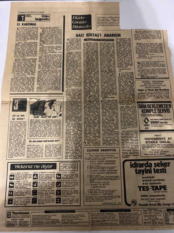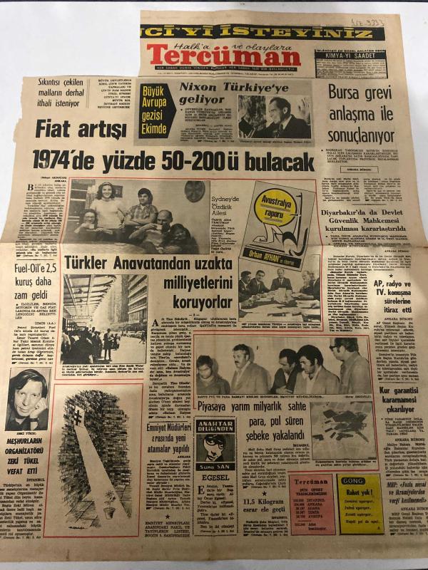 TERCÜMAN GAZETESİ - DOĞUM GÜNÜ HEDİYESİ (TURKISH NEWSPAPPER) - 24 AĞUSTOS 1973 - SADECE TEK YAPRAKTIR -Nixon-Orhan Ayhan-Zeki Türel-Suna San-Ahmet Kabaklı-Faruk K.Timurtaş-Kemal Ilıcak-Fiyat artışı 1974’de yüzde 50-200’ü bulacak-Büyük Avrupa gezisi Ekimde-Nixon Türkiye’ye geliyor-Bursa grevi anlaşma ile sonuçlanıyor-Türkler Anavatandan uzakta milliyetlerini koruyorlar-Piyasaya yarım milyarlık sahte para pul süren şebeke yakalandı-Diyarbakır’da da Devlet Güvenlik Mahkemesi kurulması kararlaştırıldı-Meşhurların organizatörü Zeki Türel vefat etti-Gün Işığında-13 Kazımal-Hacı Bektaş’ı anarken-Yıldızınız ne diyor-Eleman aranıyor-Sıra beklemeden komple servis-Üniversiteye bu kitaplarla girilir-İdrarda şeker tayini testi adlı eser Türkçe dilindedir.