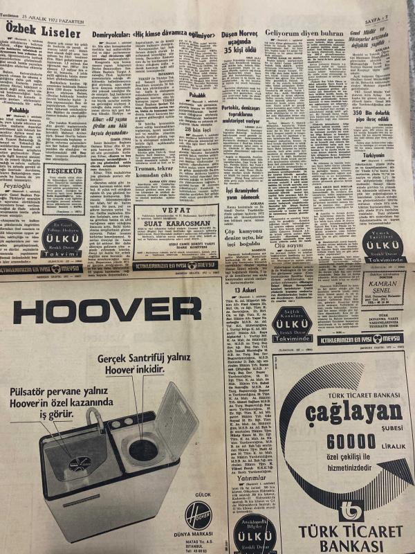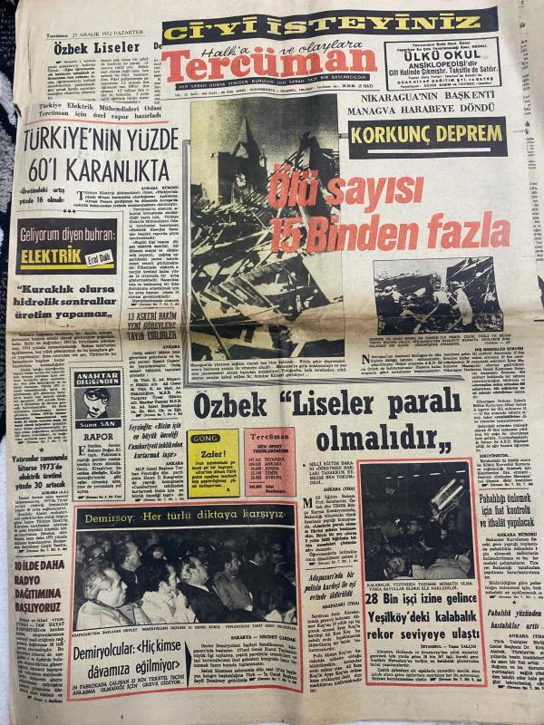 TERCÜMAN GAZETESİ - DOĞUM GÜNÜ HEDİYESİ (TURKISH NEWSPAPPER) - 25 ARALIK 1972 - SADECE DÖRT SAYFADIR -Bedi N Şehsuvaroğlu-Rauf Tamer-Celal Yardımcı-Kemal Ilıcak-Cevdet Sunay-Kemal Belgin-Rıdvan Uysal-Öcal Uluc-Ünal Tümün-Server Şengün-Mehmet Sezer-Türkiye’nin yüzde 60’ı karanlıkta-Korkunç deprem-Ölü sayısı 15 binden fazla-Özbek liseler liseler paralı olmalıdır-Demirsoy her türlü diktaya karşıyız-Demiryolcular hiç kimse davamıza eğilmiyor-28 bin işçi izine gelince Yeşilköy’deki kalabalık rekor seviyeye ulaştı-Tekelleştirme sevdası-Ankara-Önemli meseleler-İslam garazsız olmak insan adil olmak-Dahilerin divanları-Tararruzun Amerika’da da tepkileri büyüyor-Dış politika-Saatli maarif duvar takvimi-Osmanlıların dini siyaseti İslam elemi-Erkek memur alınacaktır-Galatasaray averajını düzeltti 5 0-Eskişehir Beşiktaş kilidini açamadı-Vefa PTT’yi üzmedi 1 3-Bursaspor Göztepe’ye rövanşı vermedi 0 0-Giresun 1 0 Altayla devam etti-Mersin Ankaragücü maçında gol yok-Toto sonuçları-Türkiye ligi puan ce, Kemal ılıcak tarafından kaleme alınmıştır. TERCÜMAN GAZETESİ - DOĞUM GÜNÜ HEDİYESİ (TURKISH NEWSPAPPER) - 25 ARALIK 1972 - SADECE DÖRT SAYFADIR -Bedi N Şehsuvaroğlu-Rauf Tamer-Celal Yardımcı-Kemal Ilıcak-Cevdet Sunay-Kemal Belgin-Rıdvan Uysal-Öcal Uluc-Ünal Tümün-Server Şengün-Mehmet Sezer-Türkiye’nin yüzde 60’ı karanlıkta-Korkunç deprem-Ölü sayısı 15 binden fazla-Özbek liseler liseler paralı olmalıdır-Demirsoy her türlü diktaya karşıyız-Demiryolcular hiç kimse davamıza eğilmiyor-28 bin işçi izine gelince Yeşilköy’deki kalabalık rekor seviyeye ulaştı-Tekelleştirme sevdası-Ankara-Önemli meseleler-İslam garazsız olmak insan adil olmak-Dahilerin divanları-Tararruzun Amerika’da da tepkileri büyüyor-Dış politika-Saatli maarif duvar takvimi-Osmanlıların dini siyaseti İslam elemi-Erkek memur alınacaktır-Galatasaray averajını düzeltti 5 0-Eskişehir Beşiktaş kilidini açamadı-Vefa PTT’yi üzmedi 1 3-Bursaspor Göztepe’ye rövanşı vermedi 0 0-Giresun 1 0 Altayla devam etti-Mersin Ankaragücü maçında gol yok-Toto sonuçları-Türkiye ligi puan ce adlı eser Türkçe dilindedir.